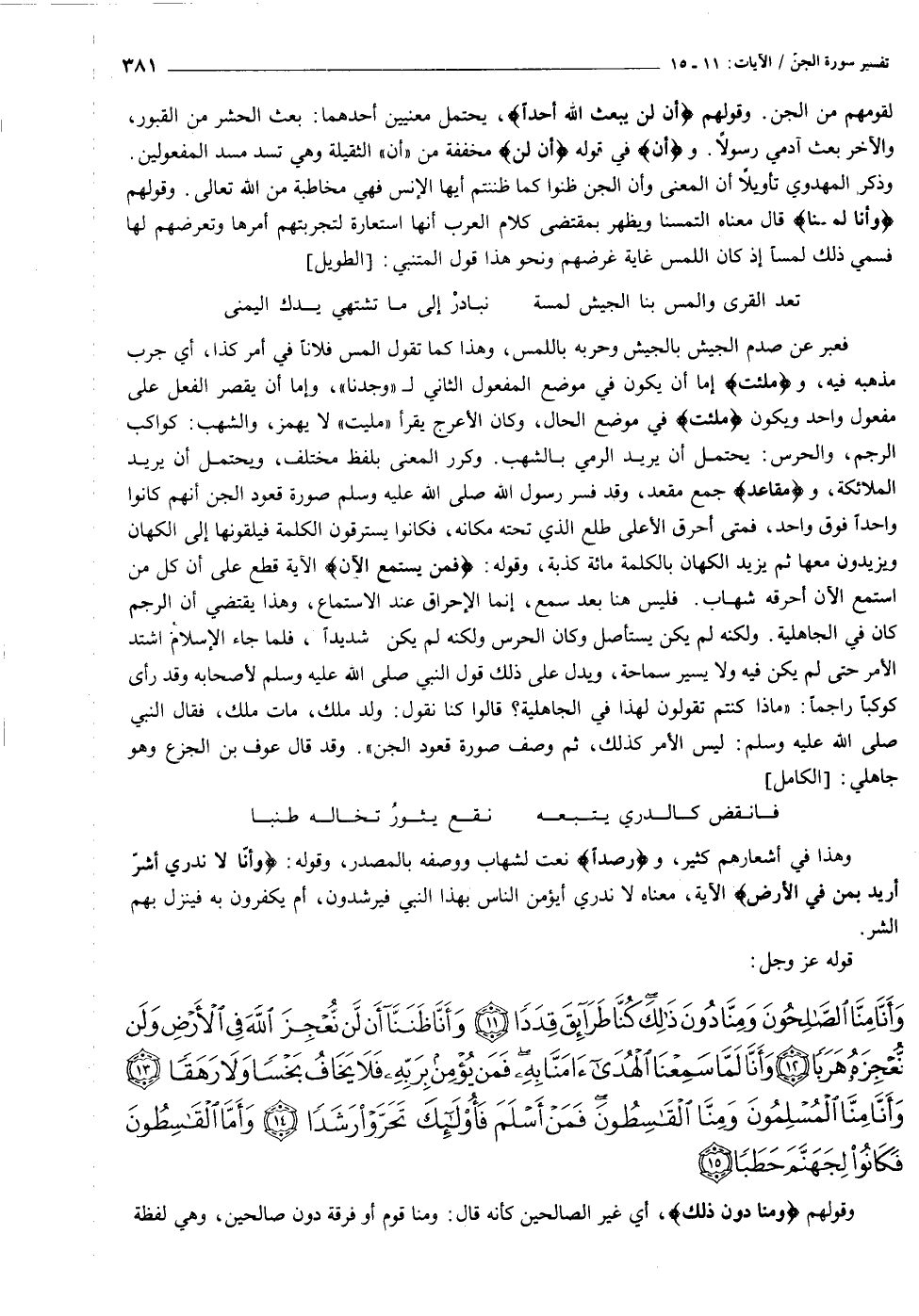 وَأَنَّا مِنَّا الصَّالِحُونَ وَمِنَّا دُونَ ذلِكَ كُنَّا طَرائِقَ قِدَداً (١١) وَأَنَّا ظَنَنَّا أَنْ لَنْ نُعْجِزَ اللَّهَ فِي الْأَرْضِ وَلَنْ نُعْجِزَهُ هَرَباً (١٢) وَأَنَّا لَمَّا سَمِعْنَا الْهُدى آمَنَّا بِهِ فَمَنْ يُؤْمِنْ بِرَبِّهِ فَلا يَخافُ بَخْساً وَلا رَهَقاً (١٣) وَأَنَّا مِنَّا الْمُسْلِمُونَ وَمِنَّا الْقاسِطُونَ فَمَنْ أَسْلَمَ فَأُولئِكَ تَحَرَّوْا رَشَداً (١٤) وَأَمَّا الْقاسِطُونَ فَكانُوا لِجَهَنَّمَ حَطَباً (١٥)