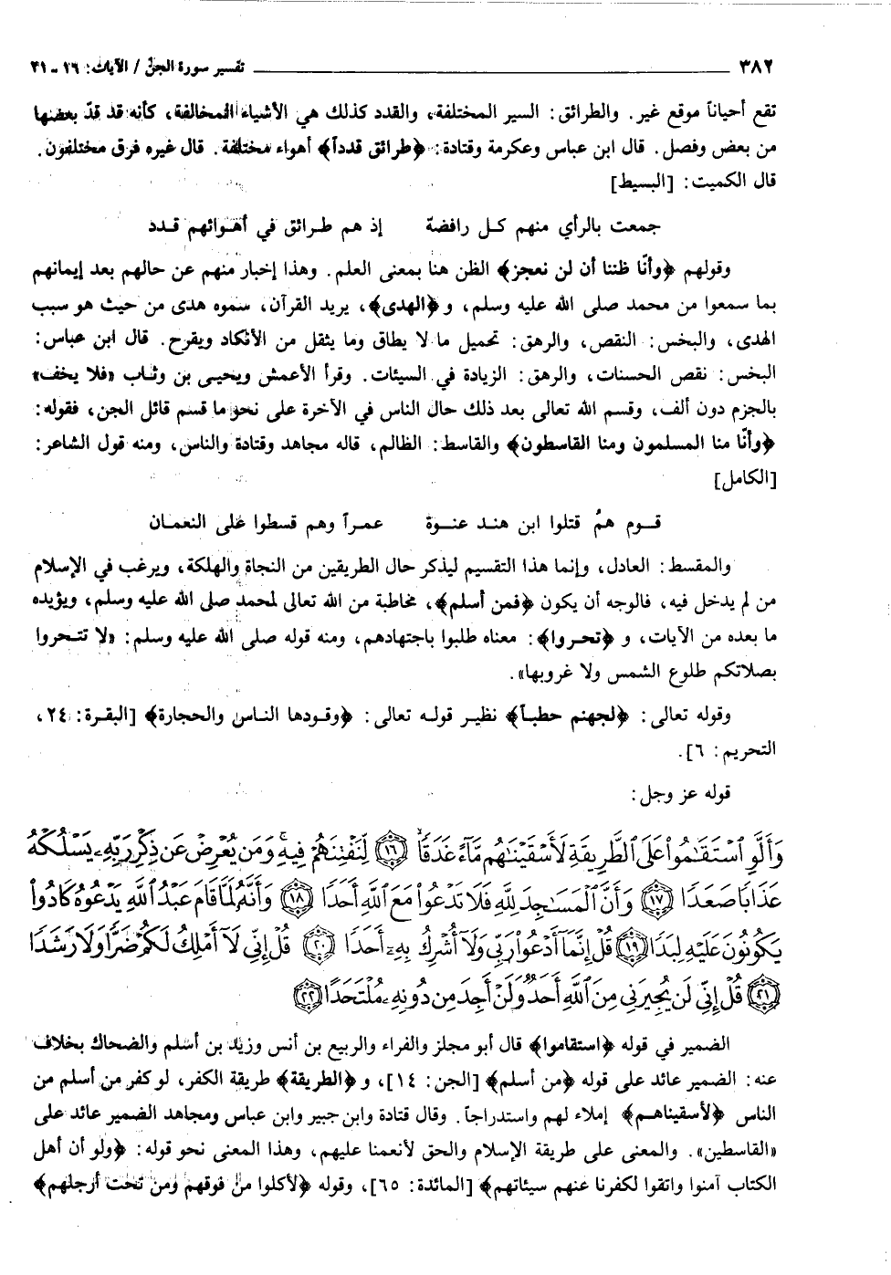 وَأَنْ لَوِ اسْتَقامُوا عَلَى الطَّرِيقَةِ لَأَسْقَيْناهُمْ ماءً غَدَقاً (١٦) لِنَفْتِنَهُمْ فِيهِ وَمَنْ يُعْرِضْ عَنْ ذِكْرِ رَبِّهِ يَسْلُكْهُ عَذاباً صَعَداً (١٧) وَأَنَّ الْمَساجِدَ لِلَّهِ فَلا تَدْعُوا مَعَ اللَّهِ أَحَداً (١٨) وَأَنَّهُ لَمَّا قامَ عَبْدُ اللَّهِ يَدْعُوهُ كادُوا يَكُونُونَ عَلَيْهِ لِبَداً (١٩) قُلْ إِنَّما أَدْعُوا رَبِّي وَلا أُشْرِكُ بِهِ أَحَداً (٢٠)