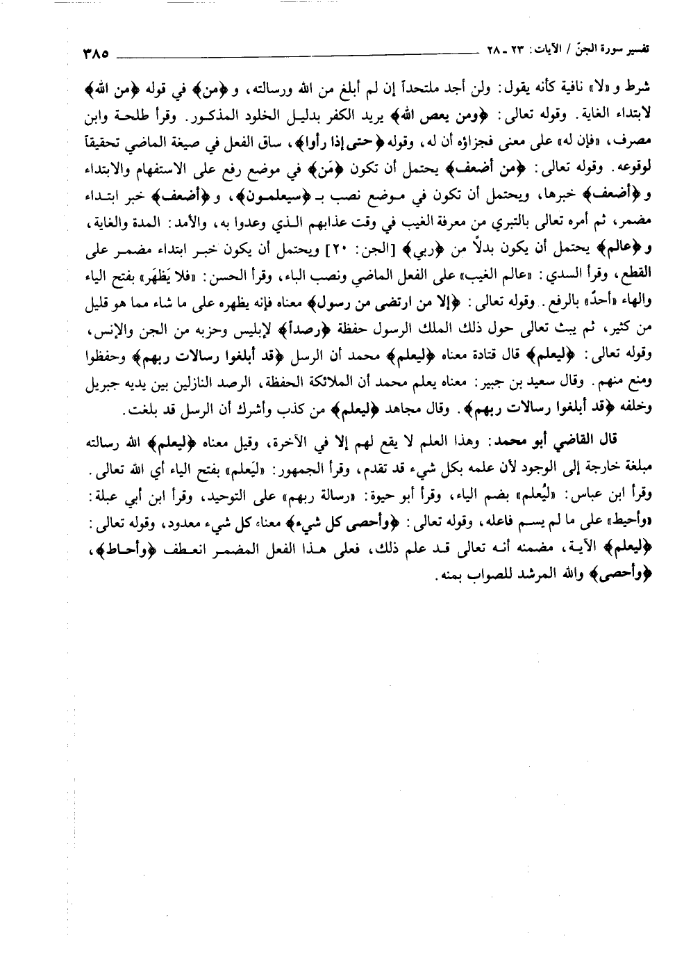 شرط و «لا» نافية كأنه يقول: ولن أجد ملتحدا إن لم أبلغ من الله ورسالته، ومِنَ في قوله مِنَ اللَّهِ لابتداء الغاية. وقوله تعالى: وَمَنْ يَعْصِ اللَّهَ يريد الكفر بدليل الخلود المذكور. وقرأ طلحة وابن مصرف، «فإن له» على معنى فجزاؤه أن له، وقوله حَتَّى إِذا رَأَوْا، ساق الفعل في صيغة الماضي تحقيقا لوقوعه. وقوله تعالى: مَنْ أَضْعَفُ يحتمل أن تكون مَنْ في موضع رفع على الاستفهام والابتداء وأَضْعَفُ خبرها، ويحتمل أن تكون في موضع نصب ب «سيعلمون» ، وأَضْعَفُ خبر ابتداء مضمر، ثم أمره تعالى بالتبري من معرفة الغيب في وقت عذابهم الذي وعدوا به، والأمد: المدة والغاية، وعالِمُ يحتمل أن يكون بدلا من رَبِّي [الجن: ٢٠] ويحتمل أن يكون خبر ابتداء مضمر على القطع، وقرأ السدي: «عالم الغيب» على الفعل الماضي ونصب الباء، وقرأ الحسن: «فلا يظهر» بفتح الياء والهاء «أحد» بالرفع. وقوله تعالى: إِلَّا مَنِ ارْتَضى مِنْ رَسُولٍ معناه فإنه يظهره على ما شاء مما هو قليل من كثير، ثم يبث تعالى حول ذلك الملك الرسول حفظة رَصَداً لإبليس وحزبه من الجن والإنس، وقوله تعالى: لِيَعْلَمَ قال قتادة معناه لِيَعْلَمَ محمد أن الرسل قَدْ أَبْلَغُوا رِسالاتِ رَبِّهِمْ وحفظوا ومنع منهم. وقال سعيد بن جبير: معناه يعلم محمد أن الملائكة الحفظة، الرصد النازلين بين يديه جبريل وخلفه قَدْ أَبْلَغُوا رِسالاتِ رَبِّهِمْ. وقال مجاهد لِيَعْلَمَ من كذب وأشرك أن الرسل قد بلغت.