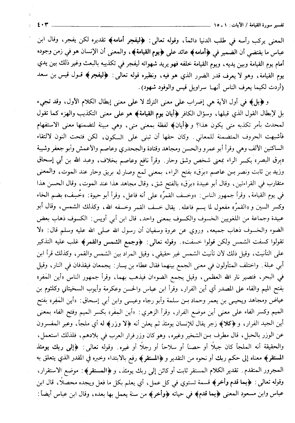وبَلْ في أول الآية هي إضراب على معنى الترك لا على معنى إبطال الكلام الأول، وقد تجيء بل لإبطال القول الذي قبلها، وسؤال الكافر أَيَّانَ يَوْمُ الْقِيامَةِ هو على معنى التكذيب والهزء كما تقول لمحدث بأمر تكذبه متى يكون هذا؟ وأَيَّانَ لفظة بمعنى متى، وهي مبينة لتضمنها معنى الاستفهام فأشبهت الحروف المتضمنة للمعاني. وكان حقها أن تبنى على السكون، لكن فتحت النون لالتقاء الساكنين الألف وهي وقرأ أبو عمرو والحسن ومجاهد وقتادة والجحدري وعاصم والأعمش وأبو جعفر وشيبة «برق البصر» بكسر الراء بمعنى شخص وشق وحار. وقرأ نافع وعاصم بخلاف، وعبد الله بن أبي إسحاق وزيد بن ثابت ونصر بن عاصم «برق» بفتح الراء، بمعنى لمع وصار له بريق وحار عند الموت، والمعنى متقارب في القراءتين، وقال أبو عبيدة «برق» بالفتح شق، وقال مجاهد هذا عند الموت، وقال الحسن هذا في يوم القيامة، وقرأ جمهور الناس: «وخسف القمر» على أنه فاعل، وقرأ أبو حيوة: «خسف» بضم الخاء وكسر السين و «القمر» مفعول لما يسم فاعله. يقال خسف القمر وخسفه الله، وكذلك الشمس، وقال أبو عبيدة وجماعة من اللغويين الخسوف والكسوف بمعنى واحد، قال ابن أبي أويس: الكسوف ذهاب بعض الضوء والخسوف ذهاب جميعه، وروي عن عروة وسفيان أن رسول الله صلى الله عليه وسلم قال: «لا تقولوا كسفت الشمس ولكن قولوا خسفت» . وقوله تعالى: وَجُمِعَ الشَّمْسُ وَالْقَمَرُ غلب عليه التذكير على التأنيث، وقيل ذلك لأن تأنيث الشمس غير حقيقي، وقيل المراد بين الشمس والقمر، وكذلك قرأ ابن أبي عبلة. واختلف المتأولون في معنى الجمع بينهما فقال عطاء بن يسار: يجمعان فيقذفان في النار، وقيل في البحر، فتصير نار الله العظمى، وقيل يجمع الضوءان فيذهب بهما، وقرأ جمهور الناس «أين المفر» بفتح الميم والفاء على المصدر أي أين الفرار، وقرأ ابن عباس والحسن وعكرمة وأيوب السختياني وكلثوم بن عياض ومجاهد ويحيى بن يعمر وحماد بن سلمة وأبو رجاء وعيسى وابن أبي إسحاق: «أين المفر» بفتح الميم وكسر الفاء على معنى أين موضع الفرار، وقرأ الزهري: «أين المفر» بكسر الميم وفتح الفاء بمعنى أين الجيد الفرار، وكَلَّا زجر يقال للإنسان يومئذ ثم يعلن أنه لا وَزَرَ له أي ملجأ، وعبر المفسرون عن الوزر بالحبل، قال مطرف بن الشخير وغيره، وهو كان وزر فرار العرب في بلادهم، فلذلك استعمل، والحقيقة أنه الملجأ كان جبلا أو حصنا أو سلاحا أو رجلا أو غيره. وقوله تعالى: إِلى رَبِّكَ يَوْمَئِذٍ الْمُسْتَقَرُّ