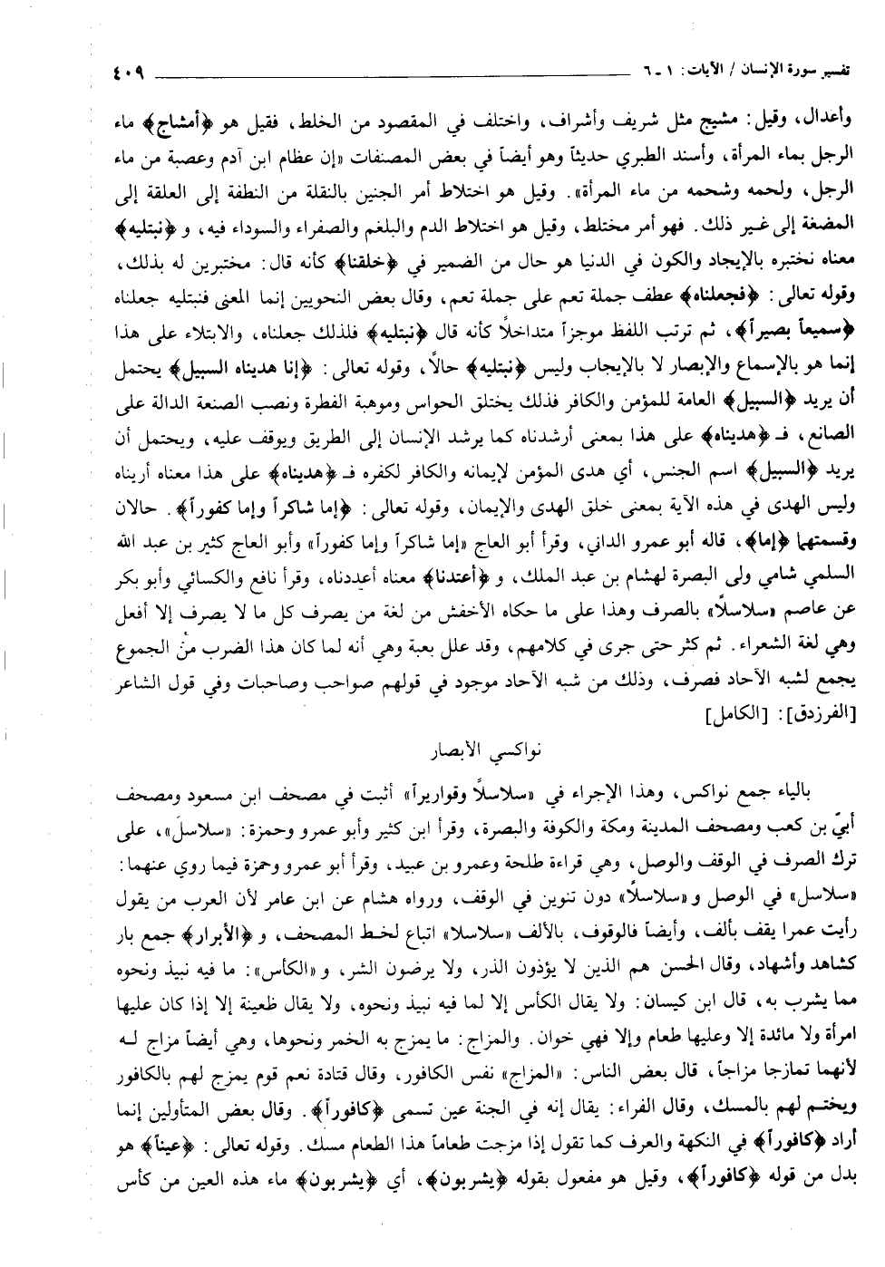 وأعدال، وقيل: مشيج مثل شريف وأشراف، واختلف في المقصود من الخلط، فقيل هو أَمْشاجٍ ماء الرجل بماء المرأة، وأسند الطبري حديثا وهو أيضا في بعض المصنفات «إن عظام ابن آدم وعصبة من ماء الرجل، ولحمه وشحمه من ماء المرأة» . وقيل هو اختلاط أمر الجنين بالنقلة من النطفة إلى العلقة إلى المضغة إلى غير ذلك. فهو أمر مختلط، وقيل هو اختلاط الدم والبلغم والصفراء والسوداء فيه، ونَبْتَلِيهِ معناه نختبره بالإيجاد والكون في الدنيا هو حال من الضمير في خَلَقْنَا كأنه قال: مختبرين له بذلك، وقوله تعالى: فَجَعَلْناهُ عطف جملة تعم على جملة تعم، وقال بعض النحويين إنما المعنى فنبتليه جعلناه سَمِيعاً بَصِيراً، ثم ترتب اللفظ موجزا متداخلا كأنه قال نَبْتَلِيهِ فلذلك جعلناه، والابتلاء على هذا إنما هو بالإسماع والإبصار لا بالإيجاب وليس نَبْتَلِيهِ حالا، وقوله تعالى: إِنَّا هَدَيْناهُ السَّبِيلَ يحتمل أن يريد السَّبِيلَ العامة للمؤمن والكافر فذلك يختلق الحواس وموهبة الفطرة ونصب الصنعة الدالة على الصانع، ف هَدَيْناهُ على هذا بمعنى أرشدناه كما يرشد الإنسان إلى الطريق ويوقف عليه، ويحتمل أن يريد السَّبِيلَ اسم الجنس، أي هدى المؤمن لإيمانه والكافر لكفره ف هَدَيْناهُ على هذا معناه أريناه وليس الهدى في هذه الآية بمعنى خلق الهدى والإيمان، وقوله تعالى: إِمَّا شاكِراً وَإِمَّا كَفُوراً. حالان وقسمتهما إِمَّا، قاله أبو عمرو الداني، وقرأ أبو العاج «إما شاكرا وإما كفورا» وأبو العاج كثير بن عبد الله السلمي شامي ولى البصرة لهشام بن عبد الملك، وأَعْتَدْنا معناه أعددناه، وقرأ نافع والكسائي وأبو بكر عن عاصم «سلاسلا» بالصرف وهذا على ما حكاه الأخفش من لغة من يصرف كل ما لا يصرف إلا أفعل وهي لغة الشعراء. ثم كثر حتى جرى في كلامهم، وقد علل بعبة وهي أنه لما كان هذا الضرب من الجموع يجمع لشبه الآحاد فصرف، وذلك من شبه الآحاد موجود في قولهم صواحب وصاحبات وفي قول الشاعر [الفرزدق] : [الكامل] نواكسي الأبصار بالياء جمع نواكس، وهذا الإجراء في «سلاسلا وقواريرا» أثبت في مصحف ابن مسعود ومصحف أبيّ بن كعب ومصحف المدينة ومكة والكوفة والبصرة، وقرأ ابن كثير وأبو عمرو وحمزة: «سلاسل» ، على ترك الصرف في الوقف والوصل، وهي قراءة طلحة وعمرو بن عبيد، وقرأ أبو عمرو وحمزة فيما روي عنهما: