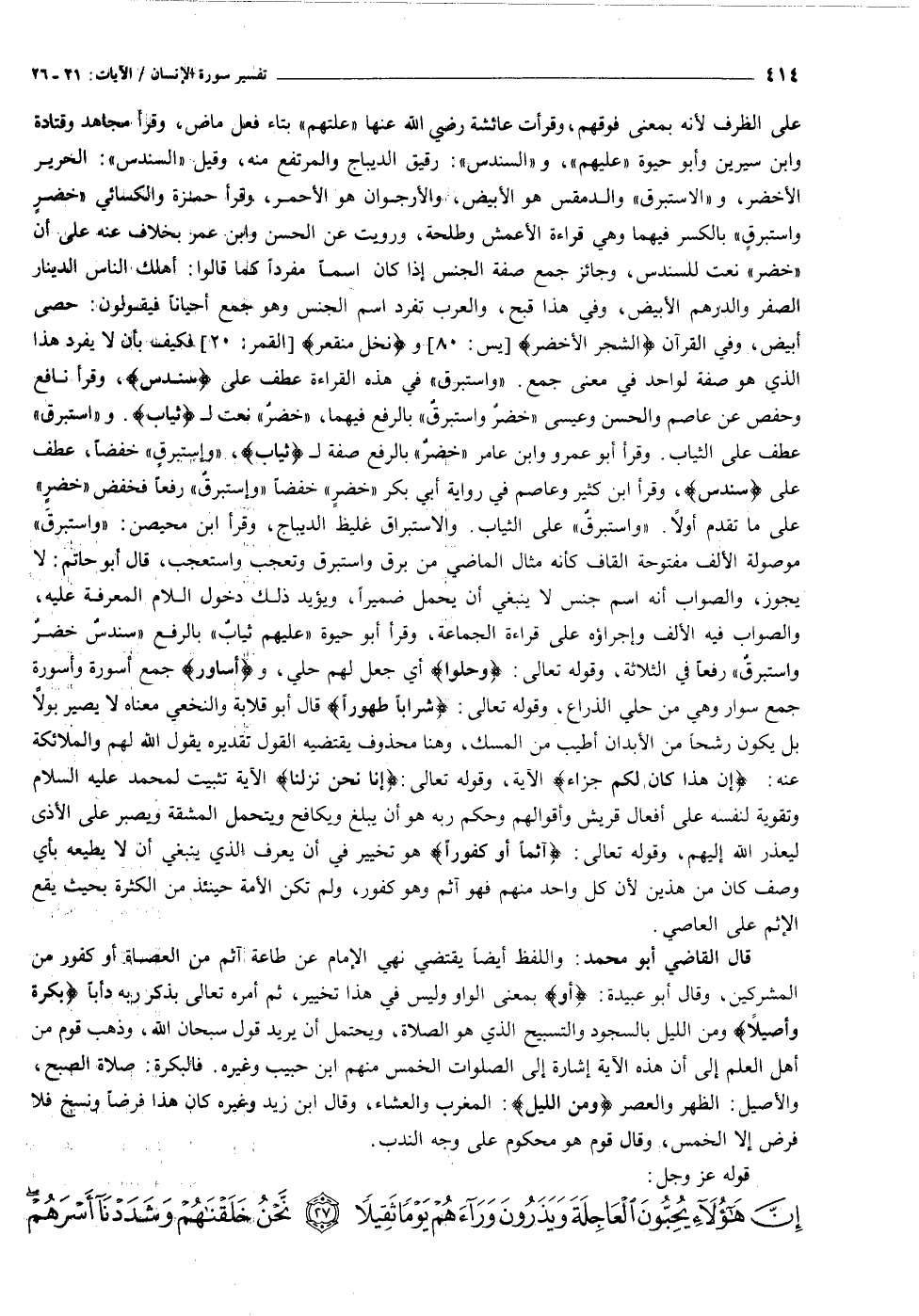 على الظرف لأنه بمعنى فوقهم، وقرأت عائشة رضي الله عنها «علتهم» بتاء فعل ماض، وقرأ مجاهد وقتادة وابن سيرين وأبو حيوة «عليهم» ، و «السندس» : رقيق الديباج والمرتفع منه، وقيل «السندس» : الحرير الأخضر، و «الإستبرق» والدمقس هو الأبيض، والأرجوان هو الأحمر، وقرأ حمزة والكسائي «خضر وإستبرق» بالكسر فيهما وهي قراءة الأعمش وطلحة، ورويت عن الحسن وابن عمر بخلاف عنه على أن «خضر» نعت للسندس، وجائز جمع صفة الجنس إذا كان اسما مفردا كما قالوا: أهلك الناس الدينار الصفر والدرهم الأبيض، وفي هذا قبح، والعرب تفرد اسم الجنس وهو جمع أحيانا فيقولون: حصى أبيض، وفي القرآن الشَّجَرِ الْأَخْضَرِ [يس: ٨٠] ونَخْلٍ مُنْقَعِرٍ [القمر: ٢٠] فكيف بأن لا يفرد هذا الذي هو صفة لواحد في معنى جمع. «وإستبرق» في هذه القراءة عطف على سُندُسٍ، وقرأ نافع وحفص عن عاصم والحسن وعيسى خُضْرٌ وَإِسْتَبْرَقٌ بالرفع فيهما، «خضر» نعت ل ثِيابُ. و «إستبرق» عطف على الثياب. وقرأ أبو عمرو وابن عامر «خضر» بالرفع صفة ل ثِيابُ، «وإستبرق» خفضا، عطف على سُندُسٍ، وقرأ ابن كثير وعاصم في رواية أبي بكر «خضر» خفضا «وإستبرق» رفعا فخفض «خضر» على ما تقدم أولا. «وإستبرق» على الثياب. والإستبرق غليظ الديباج، وقرأ ابن محيصن: «وإستبرق» موصولة الألف مفتوحة القاف كأنه مثال الماضي من برق وإستبرق وتعجب واستعجب، قال أبو حاتم: لا يجوز، والصواب أنه اسم جنس لا ينبغي أن يحمل ضميرا، ويؤيد ذلك دخول اللام المعرفة عليه، والصواب فيه الألف وإجراؤه على قراءة الجماعة، وقرأ أبو حيوة «عليهم ثياب» بالرفع «سندس خضر وإستبرق» رفعا في الثلاثة، وقوله تعالى: وَحُلُّوا أي جعل لهم حلي، و «أساور» جمع أسورة وأسورة جمع سوار وهي من حلي الذراع، وقوله تعالى: شَراباً طَهُوراً قال أبو قلابة والنخعي معناه لا يصير بولا بل يكون رشحا من الأبدان أطيب من المسك، وهنا محذوف يقتضيه القول تقديره يقول الله لهم والملائكة عنه: إِنَّ هذا كانَ لَكُمْ جَزاءً الآية، وقوله تعالى: إِنَّا نَحْنُ نَزَّلْنا الآية تثبيت لمحمد عليه السلام وتقوية لنفسه على أفعال قريش وأقوالهم وحكم ربه هو أن يبلغ ويكافح ويتحمل المشقة ويصبر على الأذى ليعذر الله إليهم، وقوله تعالى: آثِماً أَوْ كَفُوراً هو تخيير في أن يعرف الذي ينبغي أن لا يطيعه بأي وصف كان من هذين لأن كل واحد منهم فهو آثم وهو كفور، ولم تكن الأمة حينئذ من الكثرة بحيث يقع الإثم على العاصي.