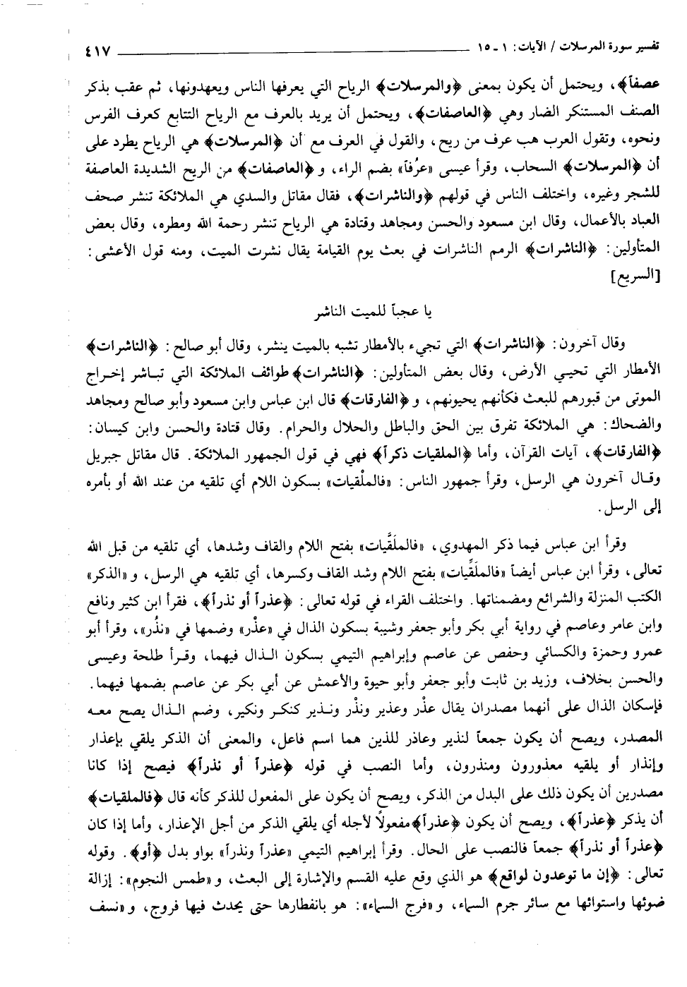 «الفارقات» ، آيات القرآن، وأما الملقيات ذِكْراً فهي في قول الجمهور الملائكة. قال مقاتل جبريل وقال آخرون هي الرسل، وقرأ جمهور الناس: «فالملقيات» بسكون اللام أي تلقيه من عند الله أو بأمره إلى الرسل.