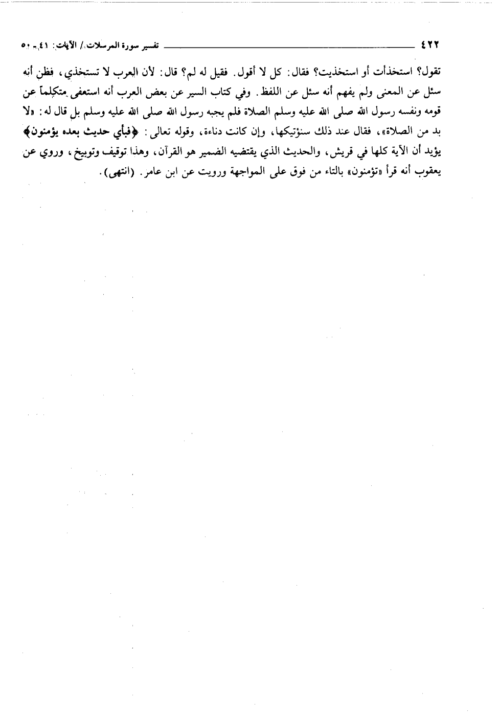 تقول؟ استخذأت أو استخذيت؟ فقال: كل لا أقول. فقيل له لم؟ قال: لأن العرب لا تستخذي، فظن أنه سئل عن المعنى ولم يفهم أنه سئل عن اللفظ. وفي كتاب السير عن بعض العرب أنه استعفى متكلما عن قومه ونفسه رسول الله صلى الله عليه وسلم الصلاة فلم يجبه رسول الله صلى الله عليه وسلم بل قال له: «لا بد من الصلاة» ، فقال عند ذلك سنؤتيكها، وإن كانت دناءة، وقوله تعالى: فَبِأَيِّ حَدِيثٍ بَعْدَهُ يُؤْمِنُونَ يؤيد أن الآية كلها في قريش، والحديث الذي يقتضيه الضمير هو القرآن، وهذا توقيف وتوبيخ، وروي عن يعقوب أنه قرأ «تؤمنون» بالتاء من فوق على المواجهة ورويت عن ابن عامر. (انتهى) .