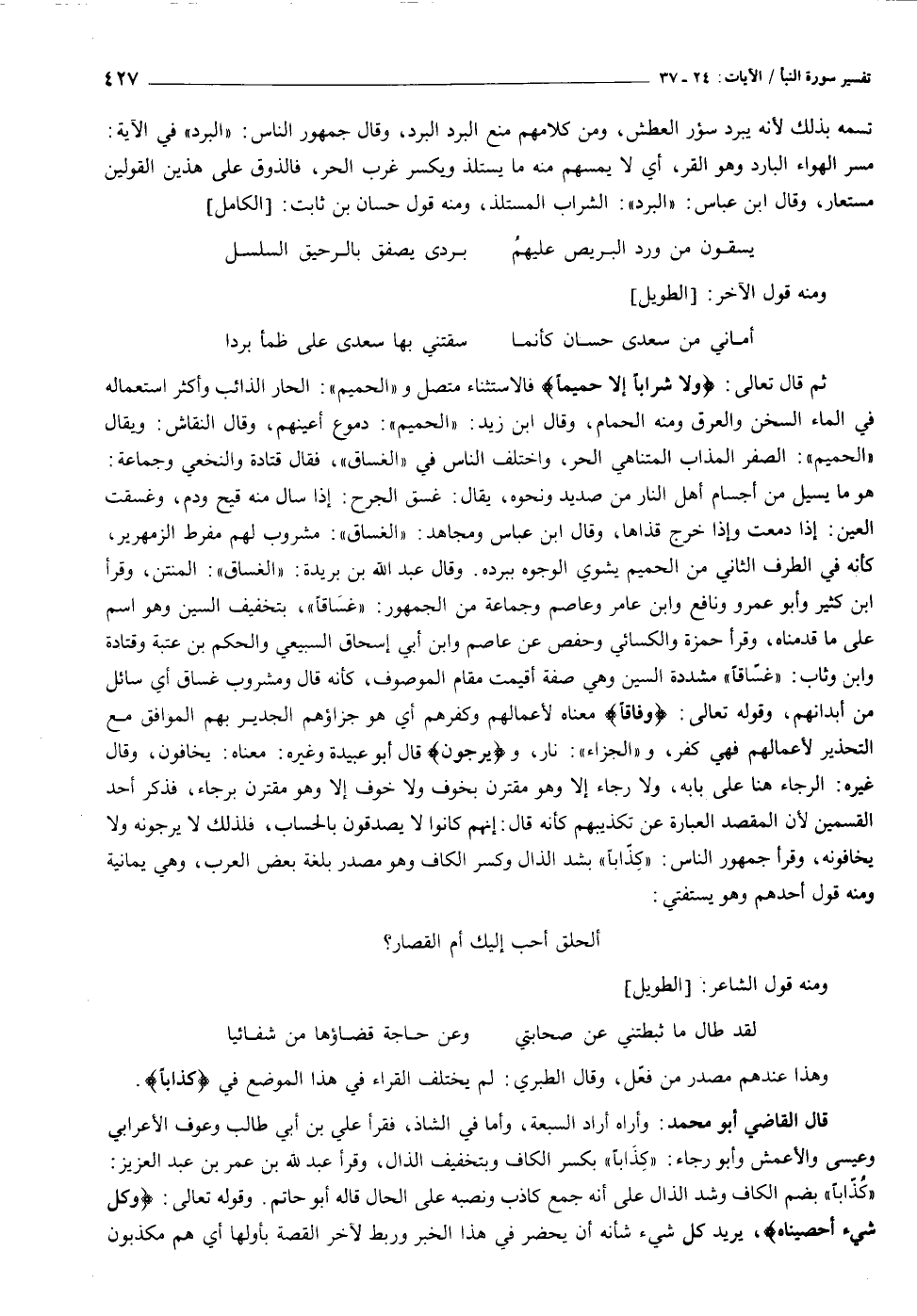 ثم قال تعالى: وَلا شَراباً إِلَّا حَمِيماً فالاستثناء متصل و «الحميم» : الحار الذائب وأكثر استعماله في الماء السخن والعرق ومنه الحمام، وقال ابن زيد: «الحميم» : دموع أعينهم، وقال النقاش: ويقال «الحميم» : الصفر المذاب المتناهي الحر، واختلف الناس في «الغساق» ، فقال قتادة والنخعي وجماعة: