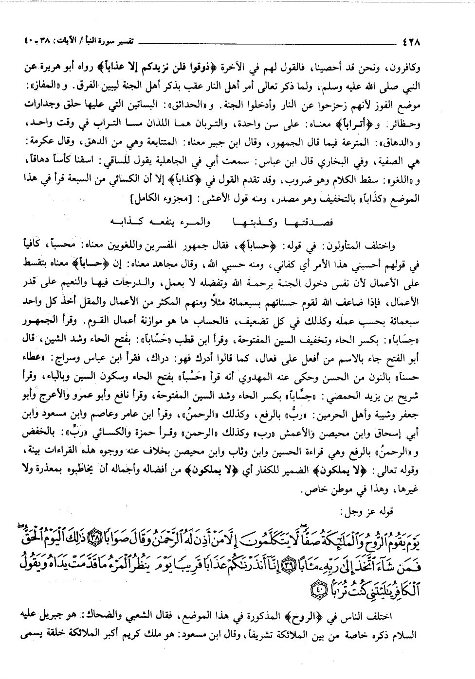 واختلف المتأولون: في قوله: حِساباً، فقال جمهور المفسرين واللغويين معناه: محسبا، كافيا في قولهم أحسبني هذا الأمر أي كفاني، ومنه حسبي الله، وقال مجاهد معناه: إن حِساباً معناه بتقسط على الأعمال لأن نفس دخول الجنة برحمة الله وتفضله لا بعمل، والدرجات فيها والنعيم على قدر الأعمال، فإذا ضاعف الله لقوم حسناتهم بسبعمائة مثلا ومنهم المكثر من الأعمال والمقل أخذ كل واحد سبعمائة بحسب عمله وكذلك في كل تضعيف، فالحساب ها هو موازنة أعمال القوم. وقرأ الجمهور «حسابا» : بكسر الحاء وتخفيف السين المفتوحة، وقرأ ابن قطب «حسابا» : بفتح الحاء وشد الشين، قال أبو الفتح جاء بالاسم من أفعل على فعال، كما قالوا أدرك فهو: دراك، فقرأ ابن عباس وسراج: «عطاء حسنا» بالنون من الحسن وحكى عنه المهدوي أنه قرأ «حسبا» بفتح الحاء وسكون السين وبالباء، وقرأ شريح بن يزيد الحمصي: «حسّابا» بكسر الحاء وشد السين المفتوحة، وقرأ نافع وأبو عمرو والأعرج وأبو جعفر وشيبة وأهل الحرمين: «ربّ» بالرفع، وكذلك «الرحمن» ، وقرأ ابن عامر وعاصم وابن مسعود وابن أبي إسحاق وابن محيصن والأعمش «رب» وكذلك «الرحمن» وقرأ حمزة والكسائي «ربّ» : بالخفض و «الرحمن» بالرفع وهي قراءة الحسين وابن وثاب وابن محيصن بخلاف عنه ووجوه هذه القراءات بينة، وقوله تعالى: لا يَمْلِكُونَ الضمير للكفار أي لا يَمْلِكُونَ من أفضاله وأجماله أن يخاطبوه بمعذرة ولا غيرها، وهذا في موطن خاص.