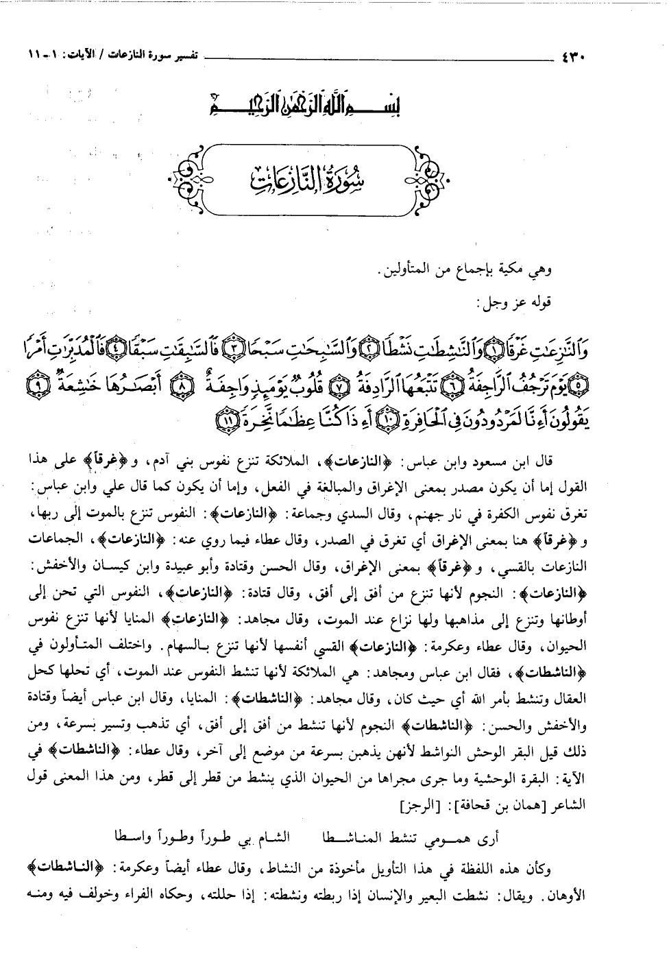 النَّازِعاتِ: النجوم لأنها تنزع من أفق إلى أفق، وقال قتادة: النَّازِعاتِ، النفوس التي تحن إلى أوطانها وتنزع إلى مذاهبها ولها نزاع عند الموت، وقال مجاهد: النَّازِعاتِ المنايا لأنها تنزع نفوس الحيوان، وقال عطاء وعكرمة: النَّازِعاتِ القسي أنفسها لأنها تنزع بالسهام. واختلف المتأولون في النَّاشِطاتِ، فقال ابن عباس ومجاهد: هي الملائكة لأنها تنشط النفوس عند الموت، أي تحلها كحل العقال وتنشط بأمر الله أي حيث كان، وقال مجاهد: النَّاشِطاتِ: المنايا، وقال ابن عباس أيضا وقتادة والأخفش والحسن: النَّاشِطاتِ النجوم لأنها تنشط من أفق إلى أفق، أي تذهب وتسير بسرعة، ومن ذلك قيل البقر الوحش النواشط لأنهن يذهبن بسرعة من موضع إلى آخر، وقال عطاء: النَّاشِطاتِ في الآية: البقرة الوحشية وما جرى مجراها من الحيوان الذي ينشط من قطر إلى قطر، ومن هذا المعنى قول الشاعر [همان بن قحافة] : [الرجز]