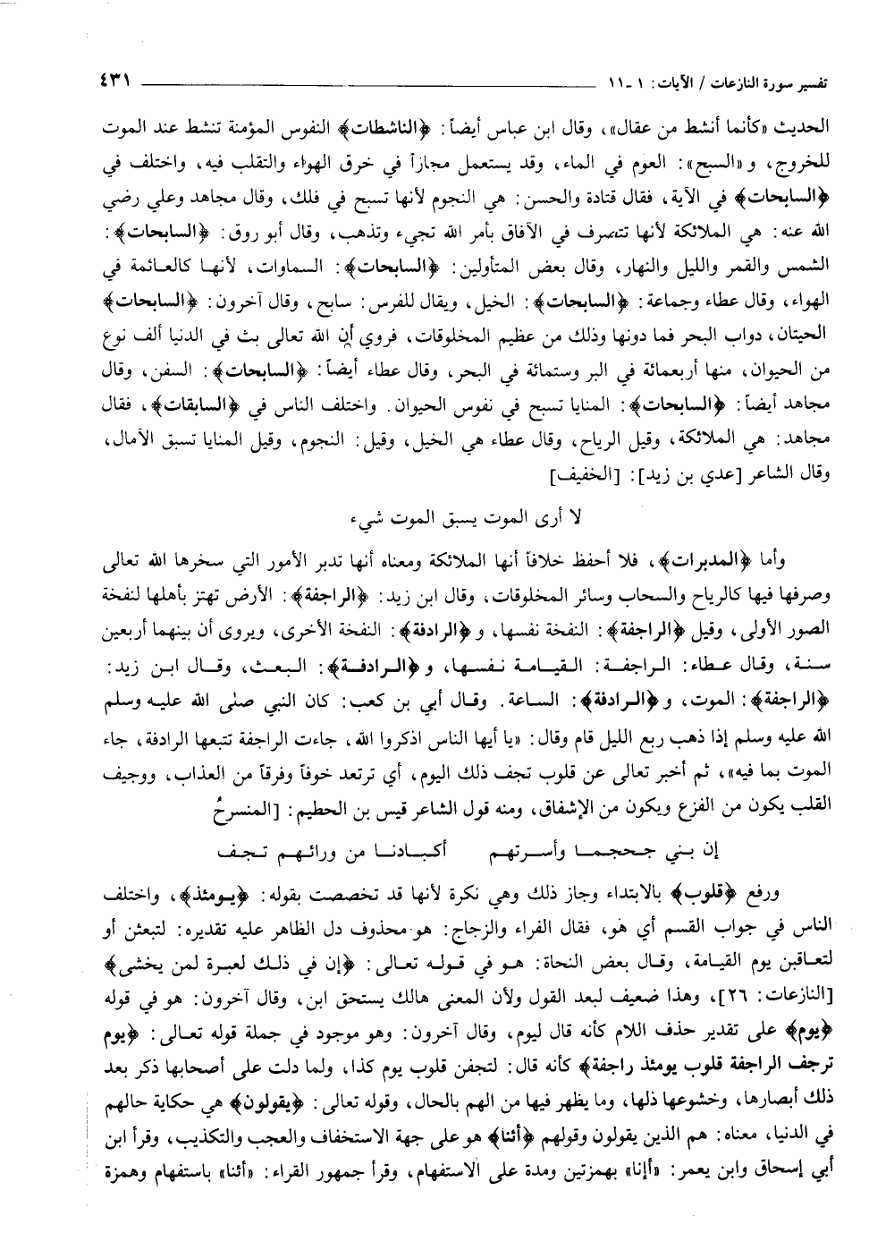 الشمس والقمر والليل والنهار، وقال بعض المتأولين: السَّابِحاتِ: السماوات، لأنها كالعائمة في الهواء، وقال عطاء وجماعة: السَّابِحاتِ: الخيل، ويقال للفرس: سابح، وقال آخرون: السَّابِحاتِ الحيتان، دواب البحر فما دونها وذلك من عظيم المخلوقات، فروي أن الله تعالى بث في الدنيا ألف نوع من الحيوان، منها أربعمائة في البر وستمائة في البحر، وقال عطاء أيضا: السَّابِحاتِ: السفن، وقال مجاهد أيضا: السَّابِحاتِ: المنايا تسبح في نفوس الحيوان. واختلف الناس في «السابقات» ، فقال مجاهد: هي الملائكة، وقيل الرياح، وقال عطاء هي الخيل، وقيل: النجوم، وقيل المنايا تسبق الآمال، وقال الشاعر [عدي بن زيد] : [الخفيف] لا أرى الموت يسبق الموت شيء وأما «المدبرات» ، فلا أحفظ خلافا أنها الملائكة ومعناه أنها تدبر الأمور التي سخرها الله تعالى وصرفها فيها كالرياح والسحاب وسائر المخلوقات، وقال ابن زيد: الرَّاجِفَةُ: الأرض تهتز بأهلها لنفخة الصور الأولى، وقيل الرَّاجِفَةُ: النفخة نفسها، والرَّادِفَةُ: النفخة الأخرى، ويروى أن بينهما أربعين سنة، وقال عطاء: الراجفة: القيامة نفسها، والرَّادِفَةُ: البعث، وقال ابن زيد: