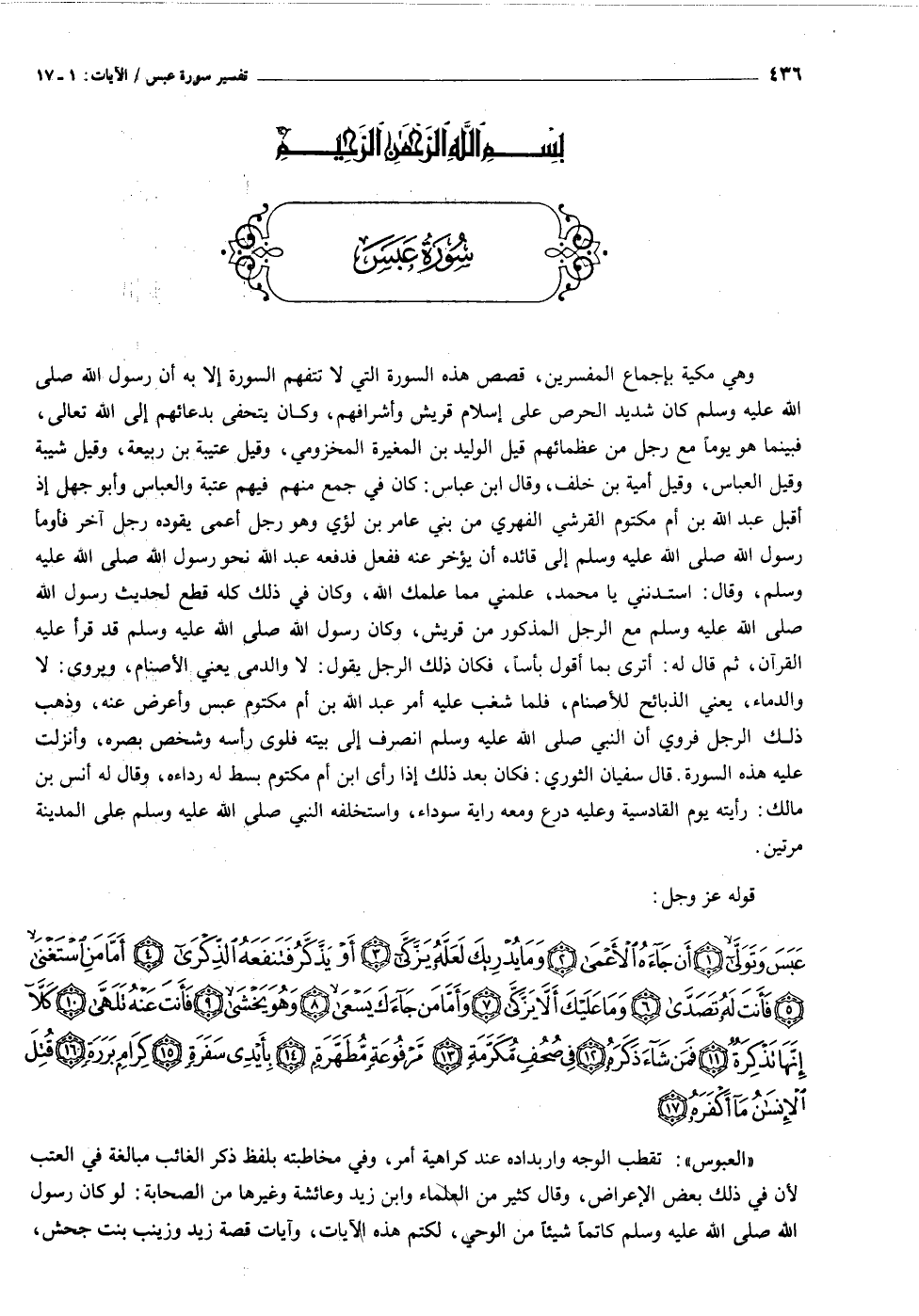 وهي مكية بإجماع المفسرين، قصص هذه السورة التي لا تتفهم السورة إلا به أن رسول الله صلى الله عليه وسلم كان شديد الحرص على إسلام قريش وأشرافهم، وكان يتحفى بدعائهم إلى الله تعالى، فبينما هو يوما مع رجل من عظمائهم قيل الوليد بن المغيرة المخزومي، وقيل عتيبة بن ربيعة، وقيل شيبة وقيل العباس، وقيل أمية بن خلف، وقال ابن عباس: كان في جمع منهم فيهم عتبة والعباس وأبو جهل إذ أقبل عبد الله بن أم مكتوم القرشي الفهري من بني عامر بن لؤي وهو رجل أعمى يقوده رجل آخر فأومأ رسول الله صلى الله عليه وسلم إلى قائده أن يؤخر عنه ففعل فدفعه عبد الله نحو رسول الله صلى الله عليه وسلم، وقال: استدنني يا محمد، علمني مما علمك الله، وكان في ذلك كله قطع لحديث رسول الله صلى الله عليه وسلم مع الرجل المذكور من قريش، وكان رسول الله صلى الله عليه وسلم قد قرأ عليه القرآن، ثم قال له: أترى بما أقول بأسا، فكان ذلك الرجل يقول: لا والدمى يعني الأصنام، ويروى: لا والدماء، يعني الذبائح للأصنام، فلما شغب عليه أمر عبد الله بن أم مكتوم عبس وأعرض عنه، وذهب ذلك الرجل فروي أن النبي صلى الله عليه وسلم انصرف إلى بيته فلوى رأسه وشخص بصره، وأنزلت عليه هذه السورة. قال سفيان الثوري: فكان بعد ذلك إذا رأى ابن أم مكتوم بسط له رداءه، وقال له أنس بن مالك: رأيته يوم القادسية وعليه درع ومعه راية سوداء، واستخلفه النبي صلى الله عليه وسلم على المدينة مرتين.