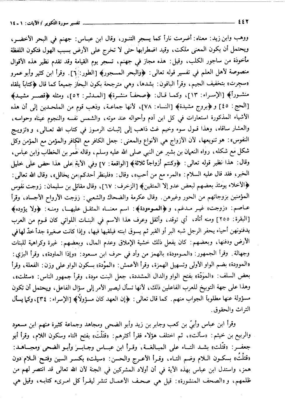 «قتلت» بسكون اللام وضم التاء، وقرأ الأعرج والحسن: «سيلت» بكسر السين وفتح اللام دون همز، واستدل ابن عباس بهذه الآية في أن أولاد المشركين في الجنة لأن الله تعالى قد انتصر لهم من ظلمهم، و «الصحف المنشورة» : قيل هي صحف الأعمال تنشر ليقرأ كل امرئ كتابه، وقيل هي