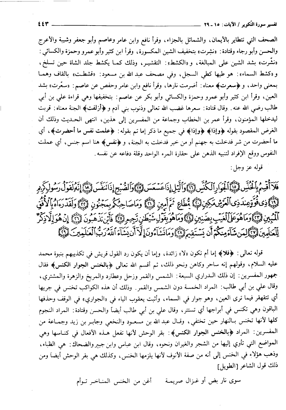قوله تعالى: فَلا إما أم تكون «لا» زائدة، وإما أن يكون رد القول قريش في تكذيبهم بنبوة محمد عليه السلام، وقولهم إنه ساحر وكاهن ونحو ذلك، ثم أقسم الله تعالى بِالْخُنَّسِ الْجَوارِ الْكُنَّسِ فقال جمهور المفسرين: إن ذلك الدراري السبعة: الشمس والقمر وزحل وعطارد والمريخ والزهرة والمشتري، وقال علي بن أبي طالب: المراد الخمسة دون الشمس والقمر. وذلك أن هذه الكواكب تخنس في جريها أي تتقهقر فيما ترى العين، وهو جوار في السماء، وأثبت يعقوب الياء في «الجواري» في الوقف وحذفها الباقون وهي تكنس في أبراجها أي تستتر، وقال علي بن أبي طالب أيضا والحسن وقتادة: المراد النجوم كلها لأنها تخنس بالنهار حين تختفي، وقال عبد الله بن مسعود والنخعي وجابر بن زيد وجماعة من المفسرين: المراد بِالْخُنَّسِ الْجَوارِ الْكُنَّسِ: بقر الوحش لأنها تفعل هذه الأفعال في كناسها وهي المواضع التي تأوي إليها من الشجر والغيران ونحوه، وقال ابن عباس وابن جبير والضحاك: هي الظباء، وذهب هؤلاء في الخنس إلى أنه من صفة الأنوف لأنها يلزمها الخنس، وكذلك هي بقر الوحش أيضا ومن ذلك قول الشاعر [الطويل]