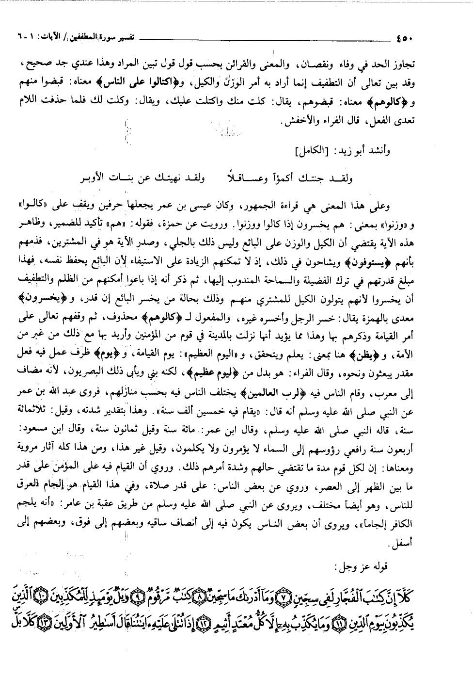 وعلى هذا المعنى هي قراءة الجمهور، وكان عيسى بن عمر يجعلها حرفين ويقف على «كالوا» و «وزنوا» بمعنى: هم يخسرون إذا كالوا ووزنوا. ورويت عن حمزة، فقوله: «هم» تأكيد للضمير، وظاهر هذه الآية يقتضي أن الكيل والوزن على البائع وليس ذلك بالجلي، وصدر الآية هو في المشترين، فذمهم بأنهم يَسْتَوْفُونَ ويشاحون في ذلك، إذ لا تمكنهم الزيادة على الاستيفاء لأن البائع يحفظ نفسه، فهذا مبلغ قدرتهم في ترك الفضيلة والسماحة المندوب إليها، ثم ذكر أنه إذا باعوا أمكنهم من الظلم والتطفيف أن يخسروا لأنهم يتولون الكيل للمشتري منهم وذلك بحالة من يخسر البائع إن قدر، ويُخْسِرُونَ معدى بالهمزة يقال: خسر الرجل وأخسره غيره، والمفعول ل كالُوهُمْ محذوف، ثم وقفهم تعالى على أمر القيامة وذكرهم بها وهذا مما يؤيد أنها نزلت بالمدينة في قوم من المؤمنين وأريد بها مع ذلك من غبر من الأمة، ويَظُنُّ هنا بمعنى: يعلم ويتحقق، و «اليوم العظيم» : يوم القيامة، ويَوْمَ ظرف عمل فيه فعل مقدر يبعثون ونحوه، وقال الفراء: هو بدل من لِيَوْمٍ عَظِيمٍ، لكنه بني ويأبى ذلك البصريون، لأنه مضاف إلى معرب، وقام الناس فيه لِرَبِّ الْعالَمِينَ يختلف الناس فيه بحسب منازلهم، فروى عبد الله بن عمر عن النبي صلى الله عليه وسلم أنه قال: «يقام فيه خمسين ألف سنة» . وهذا بتقدير شدته، وقيل: ثلاثمائة سنة، قاله النبي صلى الله عليه وسلم، وقال ابن عمر: مائة سنة وقيل ثمانون سنة، وقال ابن مسعود: