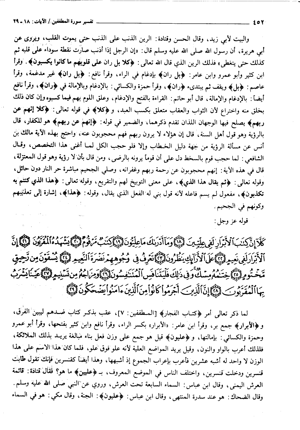 كَلاَّ إِنَّ كِتابَ الْأَبْرارِ لَفِي عِلِّيِّينَ (١٨) وَما أَدْراكَ ما عِلِّيُّونَ (١٩) كِتابٌ مَرْقُومٌ (٢٠) يَشْهَدُهُ الْمُقَرَّبُونَ (٢١) إِنَّ الْأَبْرارَ لَفِي نَعِيمٍ (٢٢)