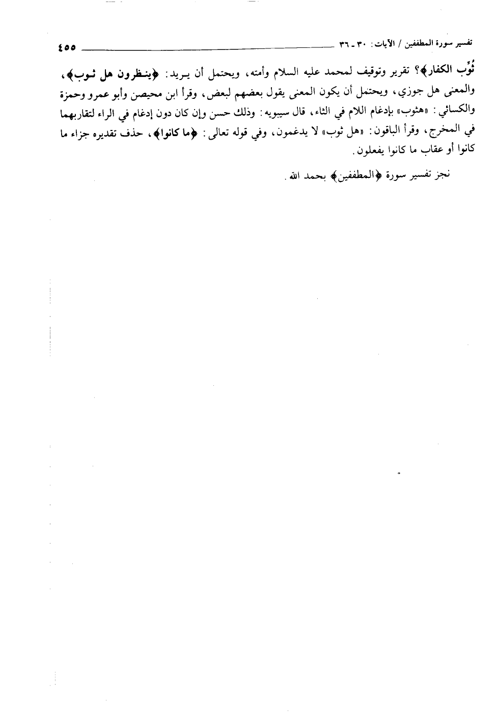 ثُوِّبَ الْكُفَّارُ؟ تقرير وتوقيف لمحمد عليه السلام وأمته، ويحتمل أن يريد: يَنْظُرُونَ هَلْ ثُوِّبَ، والمعنى هل جوزي، ويحتمل أن يكون المعنى يقول بعضهم لبعض، وقرأ ابن محيصن وأبو عمرو وحمزة والكسائي: «هثوب» بإدغام اللام في الثاء، قال سيبويه: وذلك حسن وإن كان دون إدغام في الراء لتقاربهما في المخرج، وقرأ الباقون: «هل ثوب» لا يدغمون، وفي قوله تعالى: ما كانُوا، حذف تقديره جزاء ما كانوا أو عقاب ما كانوا يفعلون.