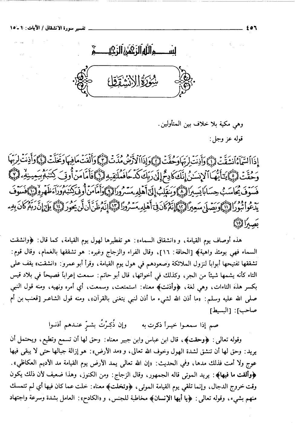 إِذَا السَّماءُ انْشَقَّتْ (١) وَأَذِنَتْ لِرَبِّها وَحُقَّتْ (٢) وَإِذَا الْأَرْضُ مُدَّتْ (٣) وَأَلْقَتْ ما فِيها وَتَخَلَّتْ (٤)