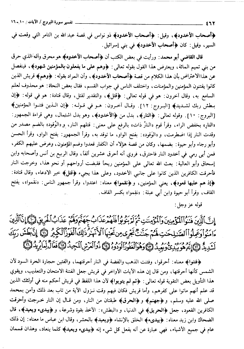 قال القاضي أبو محمد: ورأيت في بعض الكتب أن أَصْحابُ الْأُخْدُودِ هو محرق وآله الذي حرق من بني تميم المائة، ويعترض هذا القول بقوله تعالى: وَهُمْ عَلى ما يَفْعَلُونَ بِالْمُؤْمِنِينَ شُهُودٌ، فينفصل عن هذا الاعتراض بأن هذا الكلام من قصة أَصْحابُ الْأُخْدُودِ، وأن المراد بقوله: وَهُمْ قريش الذين كانوا يفتنون المؤمنين والمؤمنات، واختلف الناس في جواب القسم، فقال بعض النحاة: هو محذوف لعلم السامع به، وقال آخرون: هو في قوله تعالى: قُتِلَ، والتقدير لقتل، وقال قتادة: هو في قوله: إِنَّ بَطْشَ رَبِّكَ لَشَدِيدٌ [البروج: ١٢] . وقال آخرون: هو في قوله: إِنَّ الَّذِينَ فَتَنُوا الْمُؤْمِنِينَ [البروج: ١٠] . وقوله تعالى: النَّارِ، بدل من الْأُخْدُودِ، وهو بدل اشتمال، وهي قراءة الجمهور: