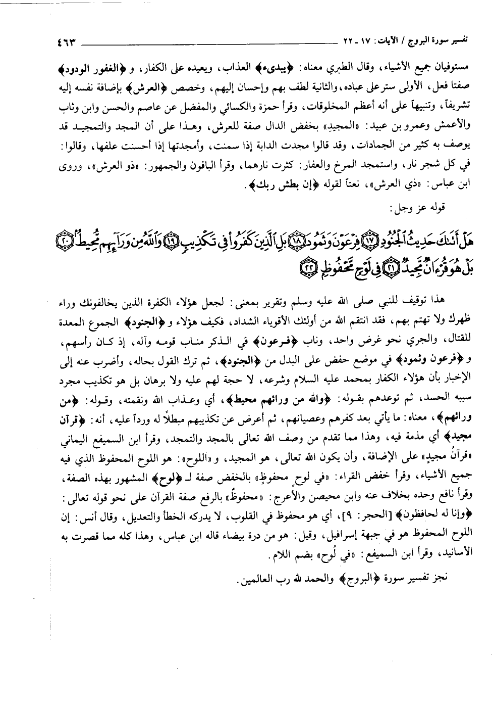 نجز تفسير سورة الْبُرُوجِ والحمد لله رب العالمين.