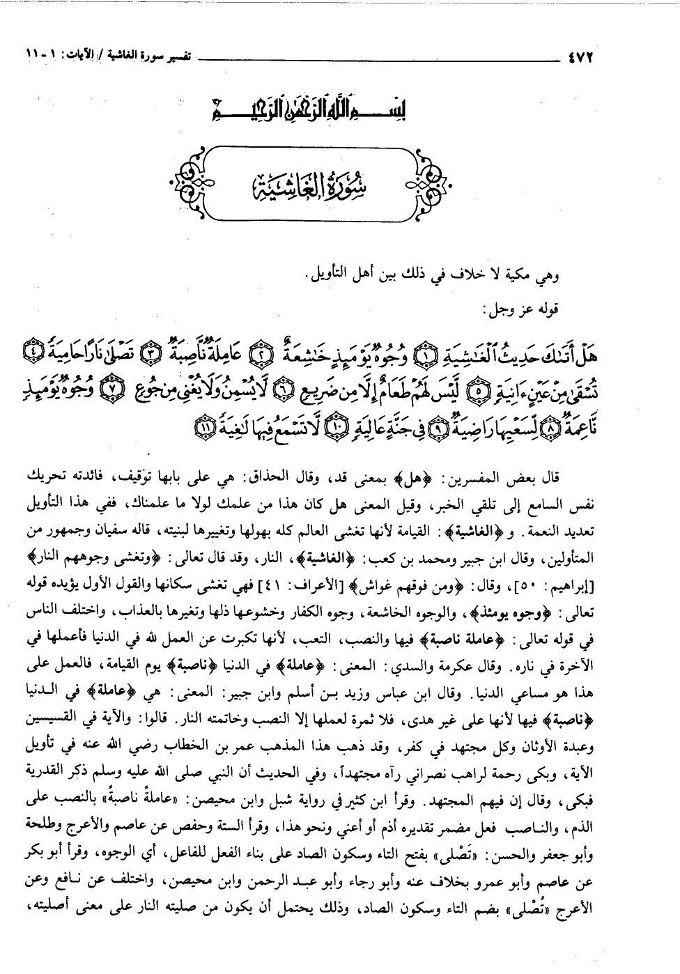 قال بعض المفسرين: هَلْ بمعنى قد، وقال الحذاق: هي على بابها توقيف، فائدته تحريك نفس السامع إلى تلقي الخبر، وقيل المعنى هل كان هذا من علمك لولا ما علمناك، ففي هذا التأويل تعديد النعمة. والْغاشِيَةِ: القيامة لأنها تغشى العالم كله بهولها وتغييرها لبنيته، قاله سفيان وجمهور من المتأولين، وقال ابن جبير ومحمد بن كعب: الْغاشِيَةِ، النار، وقد قال تعالى: وَتَغْشى وُجُوهَهُمُ النَّارُ [إبراهيم: ٥٠] ، وقال: وَمِنْ فَوْقِهِمْ غَواشٍ [الأعراف: ٤١] فهي تغشى سكانها والقول الأول يؤيده قوله تعالى: وُجُوهٌ يَوْمَئِذٍ، والوجوه الخاشعة، وجوه الكفار وخشوعها ذلها وتغيرها بالعذاب، واختلف الناس في قوله تعالى: عامِلَةٌ ناصِبَةٌ فيها والنصب، التعب، لأنها تكبرت عن العمل لله في الدنيا فأعملها في الآخرة في ناره. وقال عكرمة والسدي: المعنى: عامِلَةٌ في الدنيا ناصِبَةٌ يوم القيامة، فالعمل على هذا هو مساعي الدنيا. وقال ابن عباس وزيد بن أسلم وابن جبير: المعنى: هي عامِلَةٌ في الدنيا ناصِبَةٌ فيها لأنها على غير هدى، فلا ثمرة لعملها إلا النصب وخاتمته النار. قالوا: والآية في القسيسين وعبدة الأوثان وكل مجتهد في كفر، وقد ذهب هذا المذهب عمر بن الخطاب رضي الله عنه في تأويل الآية، وبكى رحمة لراهب نصراني رآه مجتهدا، وفي الحديث أن النبي صلى الله عليه وسلم ذكر القدرية فبكى، وقال إن فيهم المجتهد. وقرأ ابن كثير في رواية شبل وابن محيصن: «عاملة ناصبة» بالنصب على الذم، والناصب فعل مضمر تقديره أذم أو أعني ونحو هذا، وقرأ الستة وحفص عن عاصم والأعرج وطلحة وأبو جعفر والحسن: «تصلى» بفتح التاء وسكون الصاد على بناء الفعل للفاعل، أي الوجوه، وقرأ أبو بكر عن عاصم وأبو عمرو بخلاف عنه وأبو رجاء وأبو عبد الرحمن وابن محيصن، واختلف عن نافع وعن الأعرج «تصلى» بضم التاء وسكون الصاد، وذلك يحتمل أن يكون من صليته النار على معنى أصليته،