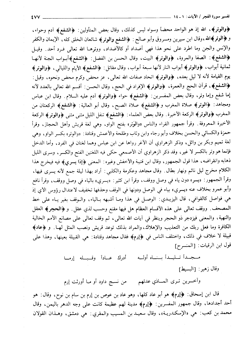 الشَّفْعِ، قرآن الحج والعمرة، وَالْوَتْرِ الإفراد في الحج، وقال الحسن: أقسم الله تعالى بالعدد لأنه إما شفع وإما وتر، وقال بعض المفسرين: الشَّفْعِ حواء وَالْوَتْرِ آدم عليه السلام. وقال ابن عباس ومجاهد: الْوَتْرِ صلاة المغرب والشَّفْعِ صلاة الصبح، وقال أبو العالية: الشَّفْعِ الركعتان من المغرب وَالْوَتْرِ الركعة الأخيرة. وقال بعض العلماء: الشَّفْعِ تنفل الليل مثنى مثنى وَالْوَتْرِ الركعة الأخيرة المعروفة. وقرأ جمهور القراء والناس «والوتر» بفتح الواو، وهي لغة قريش وأهل الحجاز، وقرأ حمزة والكسائي والحسن بخلاف وأبو رجاء وابن وثاب وطلحة والأعمش وقتادة: «والوتر» بكسر الواو، وهي لغة تميم وبكر بن وائل، وذكر الزهراوي أن الأغر رواها عن ابن عباس وهما لغتان في الفرد، وأما الدخل فإنما هو وتر بالكسر لا غير، وقد ذكر الزهراوي أن الأصمعي حكى فيه اللغتين الفتح والكسر، وسرى الليل ذهابه وانقراضه، هذا قول الجمهور، وقال ابن قتيبة والأخفش وغيره: المعنى إذا يسري فيه فيخرج هذا الكلام مخرج ليل نائم ونهار بطال. وقال مجاهد وعكرمة والكلبي: أراد بهذا ليلة جمع لأنه يسرى فيها، وقرأ الجمهور: «يسر» دون ياء في وصل ووقف، وقرأ ابن كثير: «يسري» بالياء في وصل ووقف، وقرأ نافع وأبو عمرو بخلاف عنه «يسري» بياء في الوصل ودونها في الوقف وحذفها تخفيف لاعتدال رؤوس الآي إذ هي فواصل كالقوافي، قال اليزيدي: الوصل في هذا وما أشبهه بالياء، والوقف بغير ياء على خط المصحف. ووقف تعالى على هذه الأقسام العظام هل فيها مقنع وحسب لذي عقل. و «الحجر» العقل والنهية، والمعنى فيزدجر ذو الحجر وينظر في آيات الله تعالى، ثم وقف تعالى على مصانع الأمم الخالية الكافرة وما فعل ربك من التعذيب والإهلاك، والمراد بذلك توعد قريش ونصب المثل لها. و «عاد» قبيلة لا خلاف في ذلك، واختلف الناس في إِرَمَ فقال مجاهد وقتادة: هي القبيلة بعينها، وهذا على قول ابن الرقيات: [المنسرح]