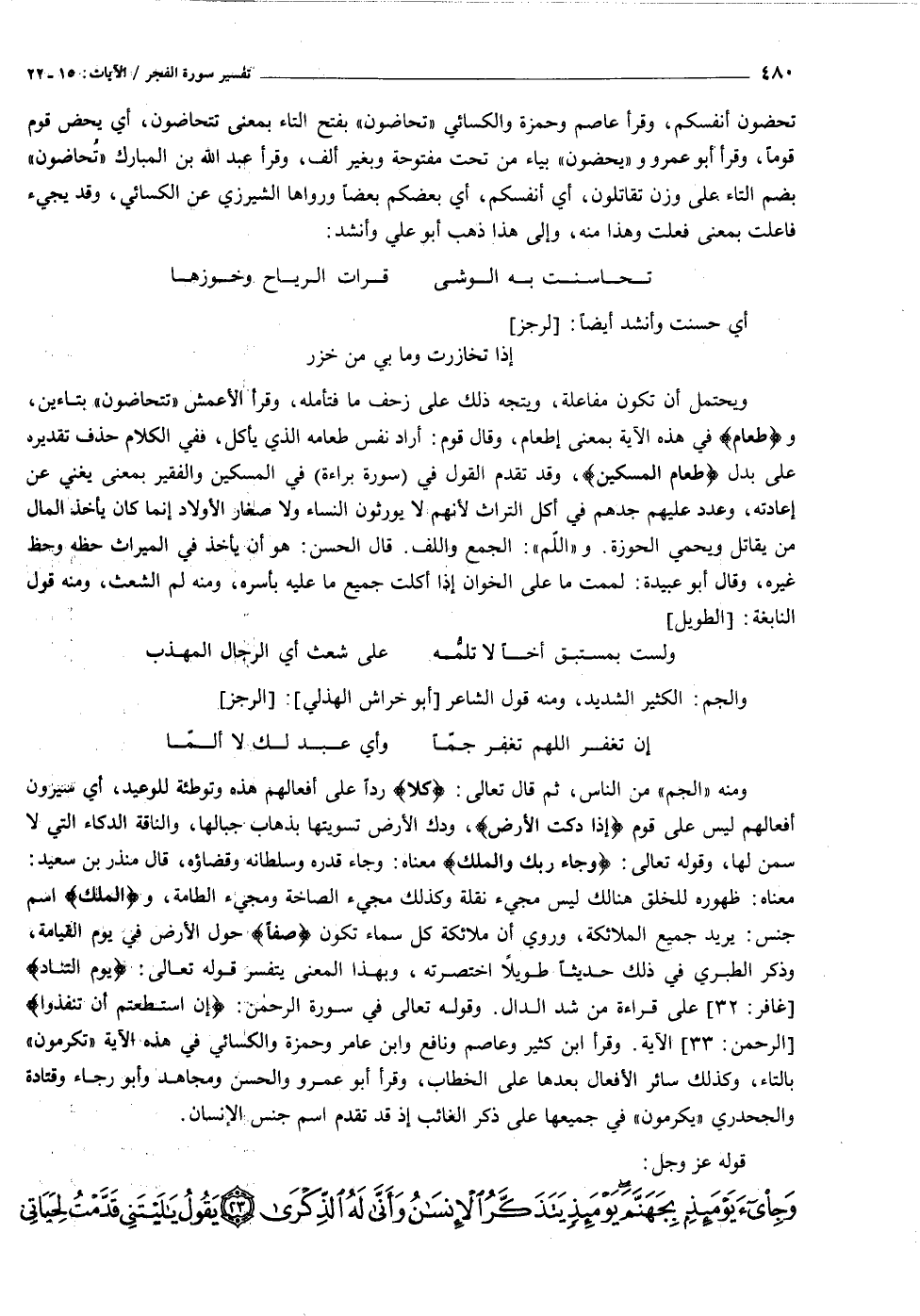 معناه: ظهوره للخلق هنالك ليس مجيء نقلة وكذلك مجيء الصاخة ومجيء الطامة، والْمَلَكُ اسم جنس: يريد جميع الملائكة، وروي أن ملائكة كل سماء تكون صَفًّا حول الأرض في يوم القيامة، وذكر الطبري في ذلك حديثا طويلا اختصرته، وبهذا المعنى يتفسر قوله تعالى: يَوْمَ التَّنادِ [غافر: ٣٢] على قراءة من شد الدال. وقوله تعالى في سورة الرحمن: إِنِ اسْتَطَعْتُمْ أَنْ تَنْفُذُوا [الرحمن: ٣٣] الآية. وقرأ ابن كثير وعاصم ونافع وابن عامر وحمزة والكسائي في هذه الآية «تكرمون» بالتاء، وكذلك سائر الأفعال بعدها على الخطاب، وقرأ أبو عمرو والحسن ومجاهد وأبو رجاء وقتادة والجحدري «يكرمون» في جميعها على ذكر الغائب إذ قد تقدم اسم جنس الإنسان.