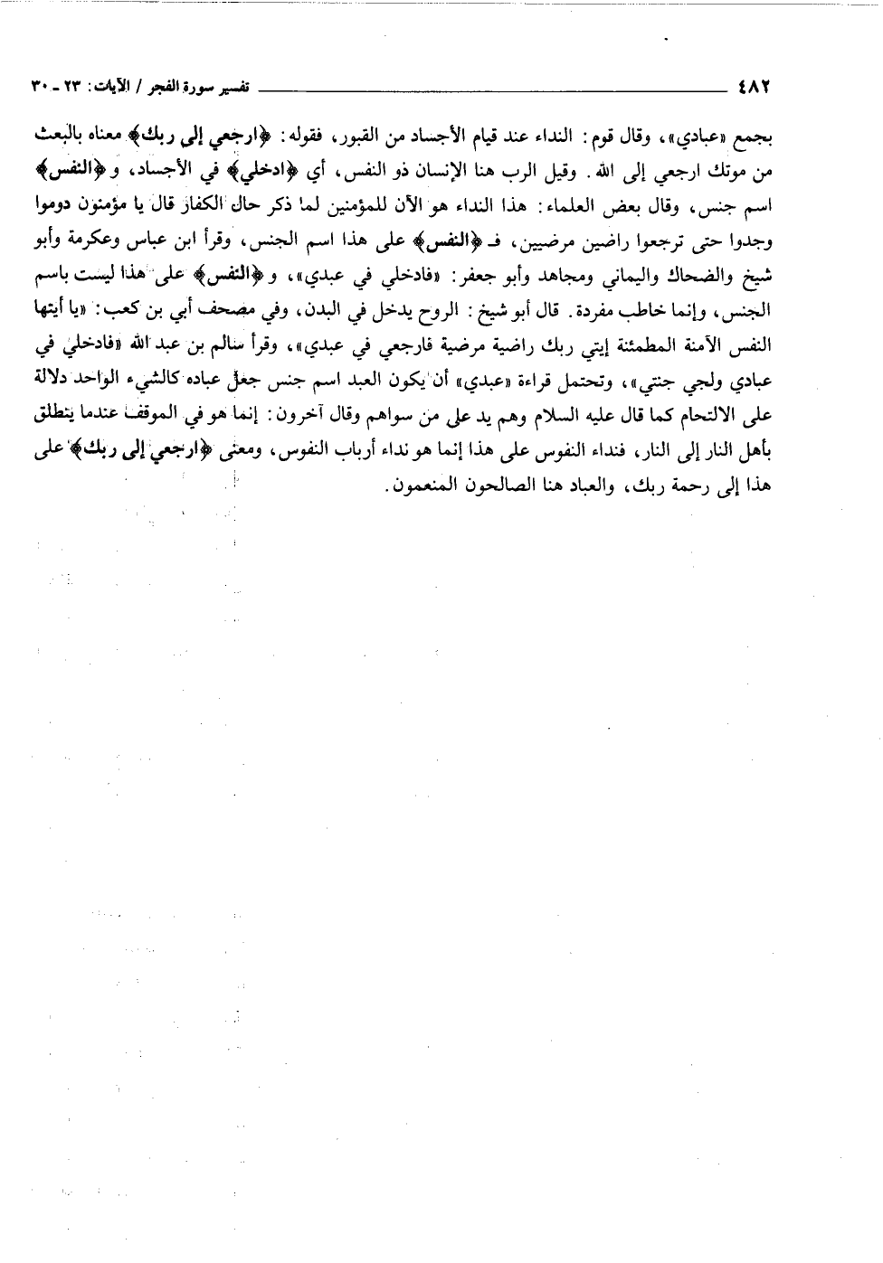 بجمع «عبادي» ، وقال قوم: النداء عند قيام الأجساد من القبور، فقوله: ارْجِعِي إِلى رَبِّكِ معناه بالبعث من موتك ارجعي إلى الله. وقيل الرب هنا الإنسان ذو النفس، أي ادْخُلِي في الأجساد، والنَّفْسُ اسم جنس، وقال بعض العلماء: هذا النداء هو الآن للمؤمنين لما ذكر حال الكفار قال يا مؤمنون دوموا وجدوا حتى ترجعوا راضين مرضيين، ف النَّفْسُ على هذا اسم الجنس، وقرأ ابن عباس وعكرمة وأبو شيخ والضحاك واليماني ومجاهد وأبو جعفر: «فادخلي في عبدي» ، والنَّفْسُ على هذا ليست باسم الجنس، وإنما خاطب مفردة. قال أبو شيخ: الروح يدخل في البدن، وفي مصحف أبي بن كعب: «يا أيتها النفس الآمنة المطمئنة إيتي ربك راضية مرضية فارجعي في عبدي» ، وقرأ سالم بن عبد الله «فادخلي في عبادي ولجي جنتي» ، وتحتمل قراءة «عبدي» أن يكون العبد اسم جنس جعل عباده كالشيء الواحد دلالة على الالتحام كما قال عليه السلام وهم يد على من سواهم وقال آخرون: إنما هو في الموقف عند ما ينطلق بأهل النار إلى النار، فنداء النفوس على هذا إنما هو نداء أرباب النفوس، ومعنى ارْجِعِي إِلى رَبِّكِ على هذا إلى رحمة ربك، والعباد هنا الصالحون المنعمون.