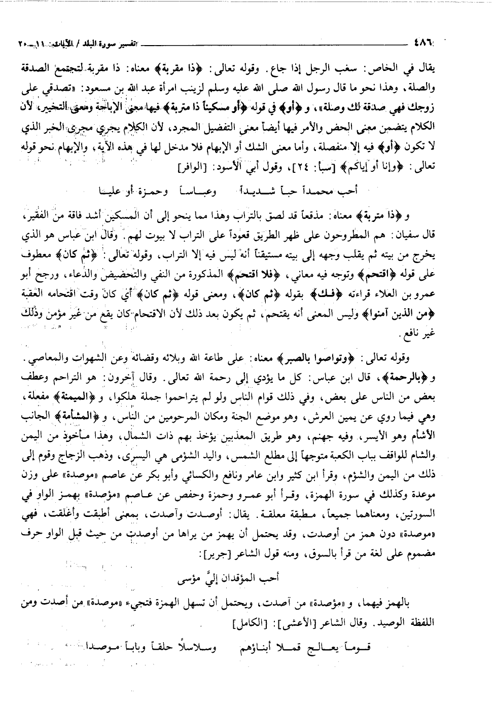 وبِالْمَرْحَمَةِ، قال ابن عباس: كل ما يؤدي إلى رحمة الله تعالى. وقال آخرون: هو التراحم وعطف بعض من الناس على بعض، وفي ذلك قوام الناس ولو لم يتراحموا جملة هلكوا، والْمَيْمَنَةِ مفعلة، وهي فيما روي عن يمين العرش، وهو موضع الجنة ومكان المرحومين من الناس، والْمَشْأَمَةِ الجانب الأشأم وهو الأيسر، وفيه جهنم، وهو طريق المعذبين يؤخذ بهم ذات الشمال، وهذا مأخوذ من اليمن والشام للواقف بباب الكعبة متوجها إلى مطلع الشمس، واليد الشؤمى هي اليسرى، وذهب الزجاج وقوم إلى ذلك من اليمن والشؤم، وقرأ ابن كثير وابن عامر ونافع والكسائي وأبو بكر عن عاصم «موصدة» على وزن موعدة وكذلك في سورة الهمزة، وقرأ أبو عمرو وحمزة وحفص عن عاصم «مؤصدة» بهمز الواو في السورتين، ومعناهما جميعا، مطبقة معلقة. يقال: أوصدت وآصدت، بمعنى أطبقت وأغلقت، فهي «موصدة» دون همز من أوصدت، وقد يحتمل أن يهمز من يراها من أوصدت من حيث قبل الواو حرف مضموم على لغة من قرأ بالسوق، ومنه قول الشاعر [جرير] :