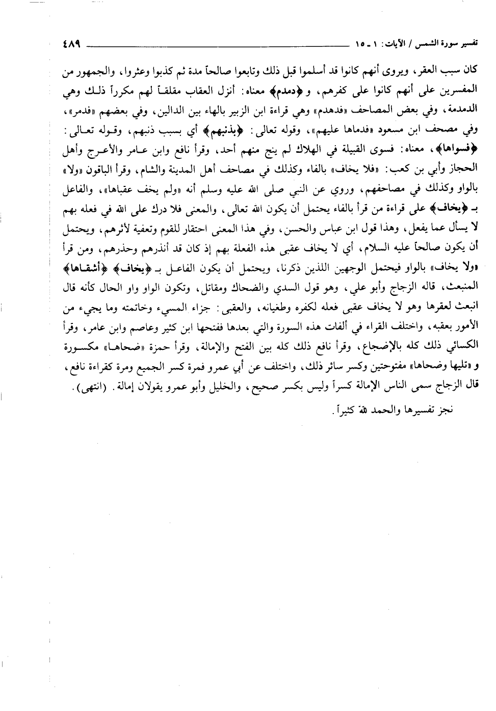 فَسَوَّاها، معناه: فسوى القبيلة في الهلاك لم ينج منهم أحد، وقرأ نافع وابن عامر والأعرج وأهل الحجاز وأبي بن كعب: «فلا يخاف» بالفاء وكذلك في مصاحف أهل المدينة والشام، وقرأ الباقون «ولا» بالواو وكذلك في مصاحفهم، وروي عن النبي صلى الله عليه وسلم أنه «ولم يخف عقباها» ، والفاعل ب يَخافُ على قراءة من قرأ بالفاء يحتمل أن يكون الله تعالى، والمعنى فلا درك على الله في فعله بهم لا يسأل عما يفعل، وهذا قول ابن عباس والحسن، وفي هذا المعنى احتقار للقوم وتعفية لأثرهم، ويحتمل أن يكون صالحا عليه السلام، أي لا يخاف عقبى هذه الفعلة بهم إذ كان قد أنذرهم وحذرهم، ومن قرأ «ولا يخاف» بالواو فيحتمل الوجهين اللذين ذكرنا، ويحتمل أن يكون الفاعل ب يَخافُ أَشْقاها المنبعث، قاله الزجاج وأبو علي، وهو قول السدي والضحاك ومقاتل، وتكون الواو واو الحال كأنه قال انبعث لعقرها وهو لا يخاف عقبى فعله لكفره وطغيانه، والعقبى: جزاء المسيء وخاتمته وما يجيء من الأمور بعقبه، واختلف القراء في ألفات هذه السورة والتي بعدها ففتحها ابن كثير وعاصم وابن عامر، وقرأ الكسائي ذلك كله بالإضجاع، وقرأ نافع ذلك كله بين الفتح والإمالة، وقرأ حمزة «ضحاها» مكسورة و «تليها وضحاها» مفتوحتين وكسر سائر ذلك، واختلف عن أبي عمرو فمرة كسر الجميع ومرة كقراءة نافع، قال الزجاج سمى الناس الإمالة كسرا وليس بكسر صحيح، والخليل وأبو عمرو يقولان إمالة. (انتهى) .