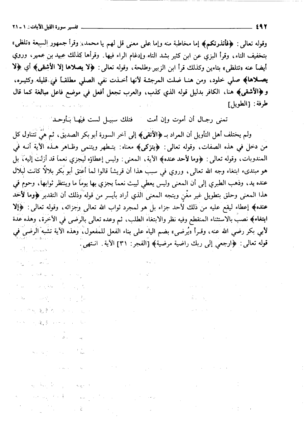ولم يختلف أهل التأويل أن المراد ب الْأَتْقَى إلى آخر السورة أبو بكر الصديق، ثم هي تتناول كل من دخل في هذه الصفات، وقوله تعالى: يَتَزَكَّى معناه: يتطهر ويتنمى وظاهر هذه الآية أنه في المندوبات، وقوله تعالى: وَما لِأَحَدٍ عِنْدَهُ الآية، المعنى: وليس إعطاؤه ليجزي نعما قد أزلت إليه، بل هو مبتدئ ابتغاء وجه الله تعالى، وروي في سبب هذا أن قريشا قالوا لما أعتق أبو بكر بلالا كانت لبلال عنده يد، وذهب الطبري إلى أن المعنى وليس يعطي ليبث نعما يجزي بها يوما ما وينتظر ثوابها، وحوم في هذا المعنى وحلق بتطويل غير مغن ويتجه المعنى الذي أراد بأيسر من قوله وذلك أن التقدير وَما لِأَحَدٍ عِنْدَهُ إعطاء ليقع عليه من ذلك لأحد جزاء بل هو لمجرد ثواب الله تعالى وجزائه، وقوله تعالى: إِلَّا ابْتِغاءَ نصب بالاستثناء المنقطع وفيه نظر والابتغاء الطلب، ثم وعده تعالى بالرضى في الآخرة، وهذه عدة لأبي بكر رضي الله عنه، وقرأ «يرضى» بضم الياء على بناء الفعل للمفعول، وهذه الآية تشبه الرضى في قوله تعالى: ارْجِعِي إِلى رَبِّكِ راضِيَةً مَرْضِيَّةً [الفجر: ٣١] الآية. انتهى.