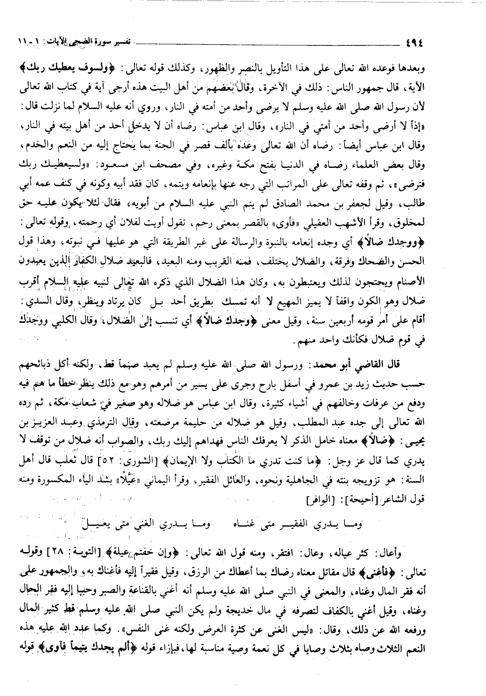 «إذا لا أرضى وأحد من أمتي في النار» ، وقال ابن عباس: رضاه أن لا يدخل أحد من أهل بيته في النار، وقال ابن عباس أيضا: رضاه أن الله تعالى وعده بألف قصر في الجنة بما يحتاج إليه من النعم والخدم، وقال بعض العلماء رضاه في الدنيا بفتح مكة وغيره، وفي مصحف ابن مسعود: «ولسيعطيك ربك فترضى» ، ثم وقفه تعالى على المراتب التي رجه عنها بإنعامه ويتمه، كان فقد أبيه وكونه في كنف عمه أبي طالب، وقيل لجعفر بن محمد الصادق لم يتم النبي عليه السلام من أبويه، فقال لئلا يكون عليه حق لمخلوق، وقرأ الأشهب العقيلي «فأوى» بالقصر بمعنى رحم، تقول أويت لفلان أي رحمته، وقوله تعالى: