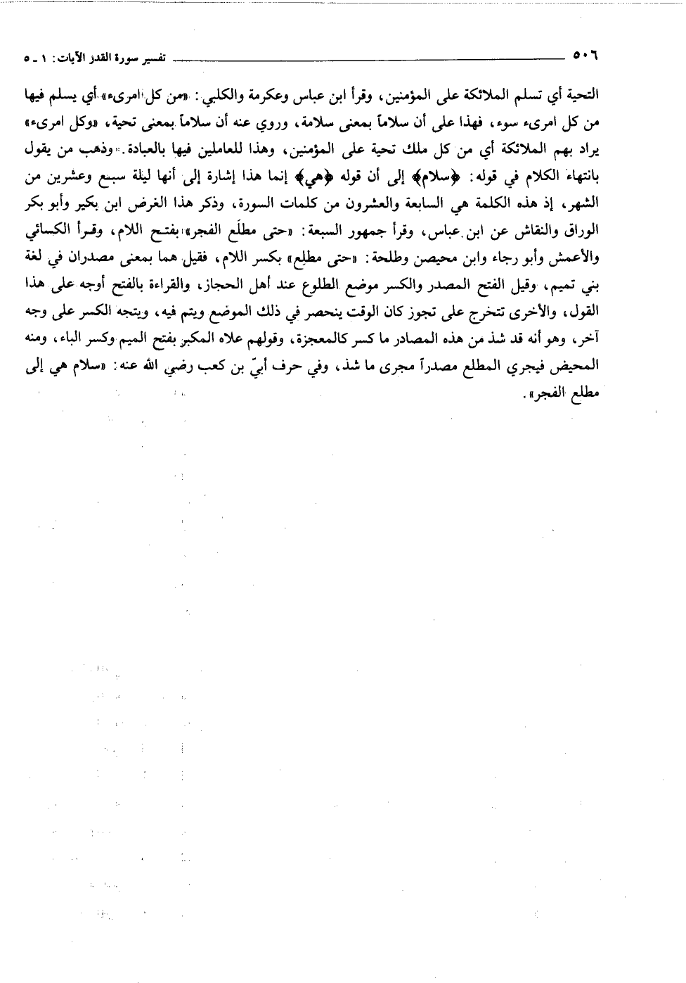 التحية أي تسلم الملائكة على المؤمنين، وقرأ ابن عباس وعكرمة والكلبي: «من كل امرئ» أي يسلم فيها من كل امرئ سوء، فهذا على أن سلاما بمعنى سلامة، وروي عنه أن سلاما بمعنى تحية، «وكل امرئ» يراد بهم الملائكة أي من كل ملك تحية على المؤمنين، وهذا للعاملين فيها بالعبادة. وذهب من يقول بانتهاء الكلام في قوله: سَلامٌ إلى أن قوله هِيَ إنما هذا إشارة إلى أنها ليلة سبع وعشرين من الشهر، إذ هذه الكلمة هي السابعة والعشرون من كلمات السورة، وذكر هذا الغرض ابن بكير وأبو بكر الوراق والنقاش عن ابن عباس، وقرأ جمهور السبعة: «حتى مطلع الفجر» بفتح اللام، وقرأ الكسائي والأعمش وأبو رجاء وابن محيصن وطلحة: «حتى مطلع» بكسر اللام، فقيل هما بمعنى مصدران في لغة بني تميم، وقيل الفتح المصدر والكسر موضع الطلوع عند أهل الحجاز، والقراءة بالفتح أوجه على هذا القول، والأخرى تتخرج على تجوز كان الوقت ينحصر في ذلك الموضع ويتم فيه، ويتجه الكسر على وجه آخر، وهو أنه قد شذ من هذه المصادر ما كسر كالمعجزة، وقولهم علاه المكبر بفتح الميم وكسر الباء، ومنه المحيض فيجري المطلع مصدرا مجرى ما شذ، وفي حرف أبيّ بن كعب رضي الله عنه: «سلام هي إلى مطلع الفجر» .