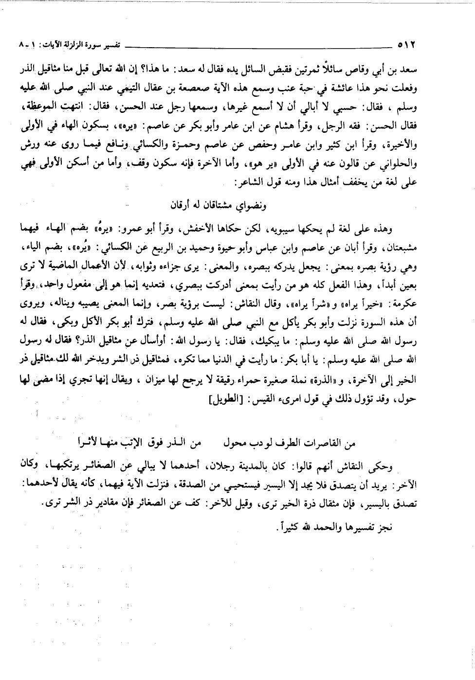 ونضواي مشتاقان له أرقان وهذه على لغة لم يحكها سيبويه، لكن حكاها الأخفش، وقرأ أبو عمرو: «يره» بضم الهاء فيهما مشبعتان، وقرأ أبان عن عاصم وابن عباس وأبو حيوة وحميد بن الربيع عن الكسائي: «يره» ، بضم الياء، وهي رؤية بصره بمعنى: يجعل يدركه ببصره، والمعنى: يرى جزاءه وثوابه، لأن الأعمال الماضية لا ترى بعين أبدا، وهذا الفعل كله هو من رأيت بمعنى أدركت ببصري، فتعديه إنما هو إلى مفعول واحد، وقرأ عكرمة: «خيرا يراه» و «شرا يراه» ، وقال النقاش: ليست برؤية بصر، وإنما المعنى يصيبه ويناله، ويروى أن هذه السورة نزلت وأبو بكر يأكل مع النبي صلى الله عليه وسلم، فترك أبو بكر الأكل وبكى، فقال له رسول الله صلى الله عليه وسلم: ما يبكيك، فقال: يا رسول الله: أو أسأل عن مثاقيل الذر؟ فقال له رسول الله صلى الله عليه وسلم: يا أبا بكر: ما رأيت في الدنيا مما تكره، فمثاقيل ذر الشر ويدخر الله لك مثاقيل ذر الخير إلى الآخرة، و «الذرة» نملة صغيرة حمراء رقيقة لا يرجح لها ميزان، ويقال إنها تجري إذا مضى لها حول، وقد تؤول ذلك في قول امرئ القيس: [الطويل]