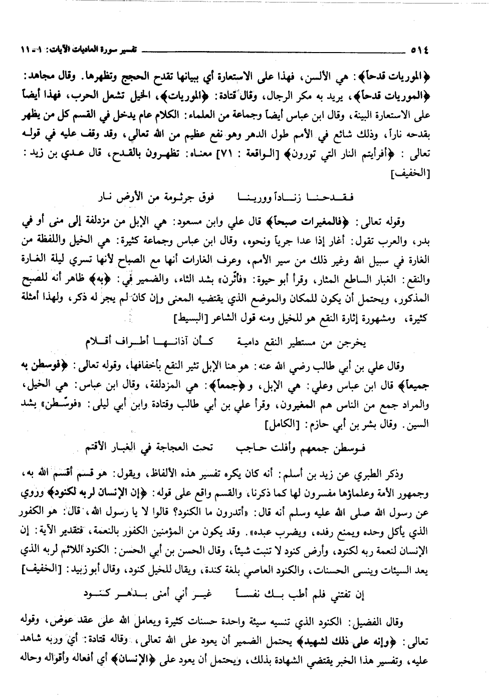 وذكر الطبري عن زيد بن أسلم: أنه كان يكره تفسير هذه الألفاظ، ويقول: هو قسم أقسم الله به، وجمهور الأمة وعلماؤها مفسرون لها كما ذكرنا، والقسم واقع على قوله: إِنَّ الْإِنْسانَ لِرَبِّهِ لَكَنُودٌ وروي عن رسول الله صلى الله عليه وسلم أنه قال: «أتدرون ما الكنود؟ قالوا لا يا رسول الله، قال: هو الكفور الذي يأكل وحده ويمنع رفده، ويضرب عبده» . وقد يكون من المؤمنين الكفور بالنعمة، فتقدير الآية: إن الإنسان لنعمة ربه لكنود، وأرض كنود لا تنبت شيئا، وقال الحسن بن أبي الحسن: الكنود اللائم لربه الذي يعد السيئات وينسى الحسنات، والكنود العاصي بلغة كندة، ويقال للخيل كنود، وقال أبو زبيد: [الخفيف]
