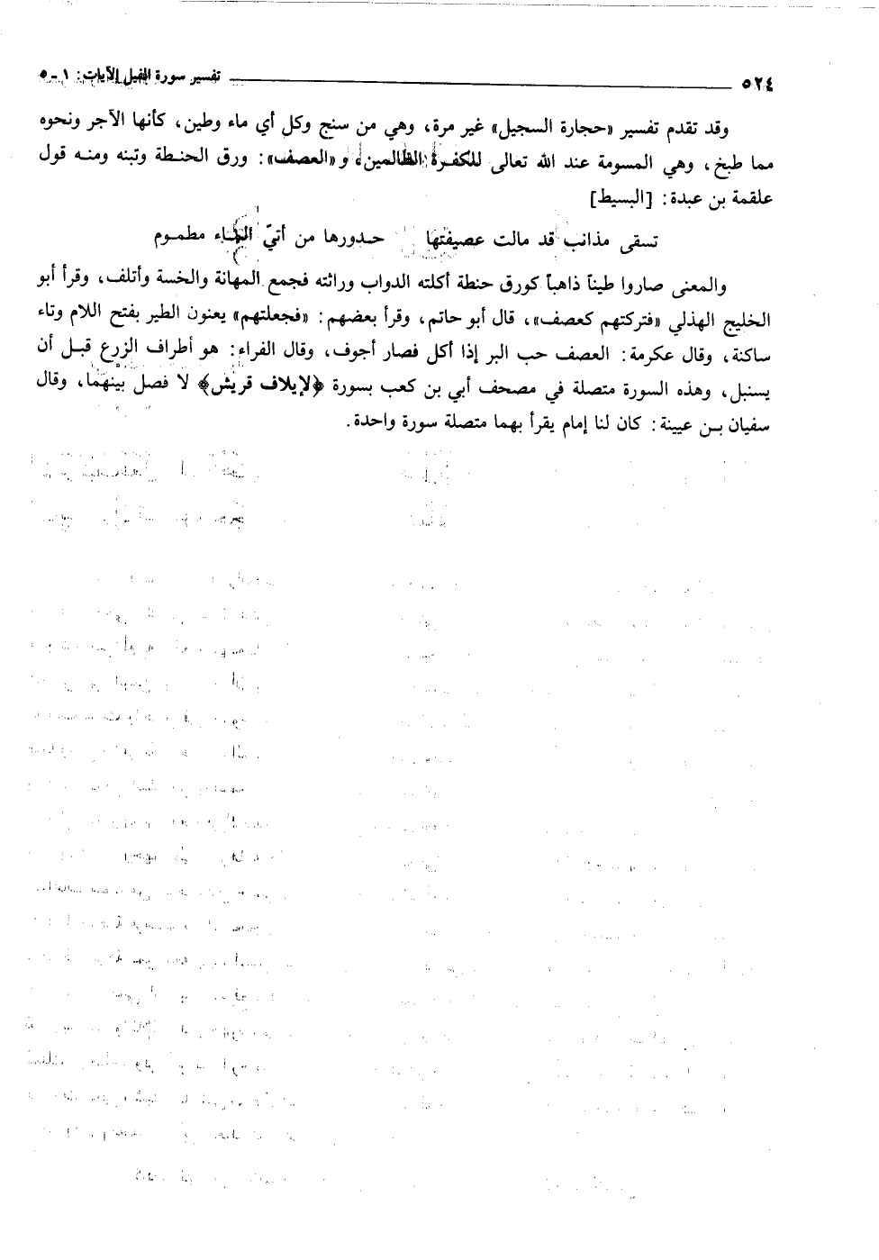 والمعنى صاروا طينا ذاهبا كورق حنطة أكلته الدواب وراثته فجمع المهانة والخسة وأتلف، وقرأ أبو الخليج الهذلي «فتركتهم كعصف» ، قال أبو حاتم، وقرأ بعضهم: «فجعلتهم» يعنون الطير بفتح اللام وتاء ساكنة، وقال عكرمة: العصف حب البر إذا أكل فصار أجوف، وقال الفراء: هو أطراف الزرع قبل أن يسنبل، وهذه السورة متصلة في مصحف أبي بن كعب بسورة لِإِيلافِ قُرَيْشٍ لا فصل بينهما، وقال سفيان بن عيينة: كان لنا إمام يقرأ بهما متصلة سورة واحدة.