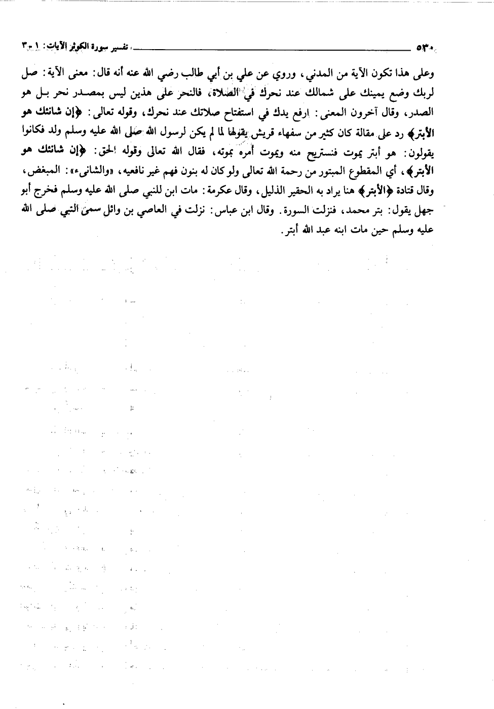وعلى هذا تكون الآية من المدني، وروي عن علي بن أبي طالب رضي الله عنه أنه قال: معنى الآية: صل لربك وضع يمينك على شمالك عند نحرك في الصلاة، فالنحر على هذين ليس بمصدر نحر بل هو الصدر، وقال آخرون المعنى: ارفع يدك في استفتاح صلاتك عند نحرك، وقوله تعالى: إِنَّ شانِئَكَ هُوَ الْأَبْتَرُ رد على مقالة كان كثير من سفهاء قريش يقولها لما لم يكن لرسول الله صلى الله عليه وسلم ولد فكانوا يقولون: هو أبتر يموت فنستريح منه ويموت أمره بموته، فقال الله تعالى وقوله الحق: إِنَّ شانِئَكَ هُوَ الْأَبْتَرُ، أي المقطوع المبتور من رحمة الله تعالى ولو كان له بنون فهم غير نافعيه، «والشانئ» : المبغض، وقال قتادة الْأَبْتَرُ هنا يراد به الحقير الذليل، وقال عكرمة: مات ابن للنبي صلى الله عليه وسلم فخرج أبو جهل يقول: بتر محمد، فنزلت السورة. وقال ابن عباس: نزلت في العاصي بن وائل سمى النبي صلى الله عليه وسلم حين مات ابنه عبد الله أبتر.