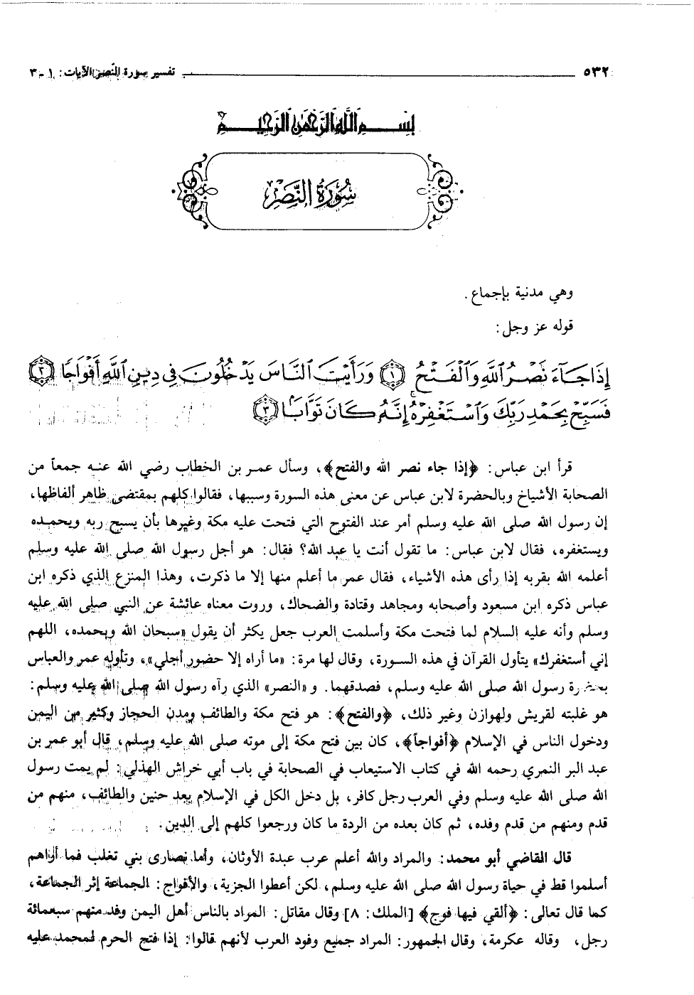 قرأ ابن عباس: إِذا جاءَ نَصْرُ اللَّهِ وَالْفَتْحُ، وسأل عمر بن الخطاب رضي الله عنه جمعا من الصحابة الأشياخ وبالحضرة لابن عباس عن معنى هذه السورة وسببها، فقالوا كلهم بمقتضى ظاهر ألفاظها، إن رسول الله صلى الله عليه وسلم أمر عند الفتوح التي فتحت عليه مكة وغيرها بأن يسبح ربه ويحمده ويستغفره، فقال لابن عباس: ما تقول أنت يا عبد الله؟ فقال: هو أجل رسول الله صلى الله عليه وسلم أعلمه الله بقربه إذا رأى هذه الأشياء، فقال عمر ما أعلم منها إلا ما ذكرت، وهذا المنزع الذي ذكره ابن عباس ذكره ابن مسعود وأصحابه ومجاهد وقتادة والضحاك، وروت معناه عائشة عن النبي صلى الله عليه وسلم وأنه عليه السلام لما فتحت مكة وأسلمت العرب جعل يكثر أن يقول «سبحان الله وبحمده، اللهم إني أستغفرك» يتأول القرآن في هذه السورة، وقال لها مرة: «ما أراه إلا حضور أجلي» ، وتأوله عمر والعباس بحضرة رسول الله صلى الله عليه وسلم، فصدقهما. و «النصر» الذي رآه رسول الله صلى الله عليه وسلم: