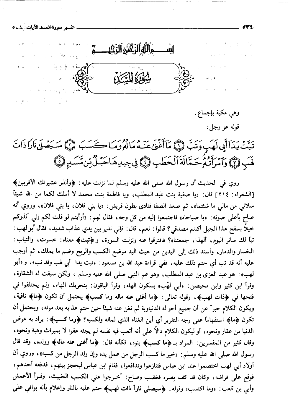 تَبَّتْ يَدا أَبِي لَهَبٍ وَتَبَّ (١) ما أَغْنى عَنْهُ مالُهُ وَما كَسَبَ (٢) سَيَصْلى ناراً ذاتَ لَهَبٍ (٣) وَامْرَأَتُهُ حَمَّالَةَ الْحَطَبِ (٤)