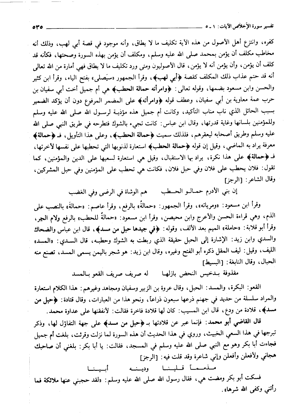 كفره، وانتزع أهل الأصول من هذه الآية تكليف ما لا يطاق، وأنه موجود في قصة أبي لهب، وذلك أنه مخاطب مكلف أن يؤمن بمحمد صلى الله عليه وسلم، ومكلف أن يؤمن بهذه السورة وصحتها، فكأنه قد كلف أن يؤمن، وأن يؤمن أنه لا يؤمن، قال الأصوليون ومتى ورد تكليف ما لا يطاق فهي أمارة من الله تعالى أنه قد حتم عذاب ذلك المكلف كقصة أَبِي لَهَبٍ، وقرأ الجمهور «سيصلى» بفتح الياء، وقرأ ابن كثير والحسن وابن مسعود بضمها، وقوله تعالى: وَامْرَأَتُهُ حَمَّالَةَ الْحَطَبِ هي أم جميل أخت أبي سفيان بن حرب عمة معاوية بن أبي سفيان، وعطف قوله وَامْرَأَتُهُ على المضمر المرفوع دون أن يؤكد الضمير بسبب الحائل الذي ناب مناب التأكيد، وكانت أم جميل هذه مؤذية لرسول الله صلى الله عليه وسلم وللمؤمنين بلسانها وغاية قدرتها، وقال ابن عباس: كانت تجيء بالشوك فتطرحه في طريق النبي صلى الله عليه وسلم وطريق أصحابه ليعقرهم، فلذلك سميت حَمَّالَةَ الْحَطَبِ، وعلى هذا التأويل، ف حَمَّالَةَ معرفة يراد به الماضي، وقيل إن قوله حَمَّالَةَ الْحَطَبِ استعارة لذنوبها التي تحطبها على نفسها لآخرتها، ف حَمَّالَةَ على هذا نكرة، يراد بها الاستقبال، وقيل هي استعارة لسعيها على الدين والمؤمنين، كما تقول: فلان يحطب على فلان وفي حبل فلان، فكانت هي تحطب على المؤمنين وفي حبل المشركين، وقال الشاعر: [الرجز]