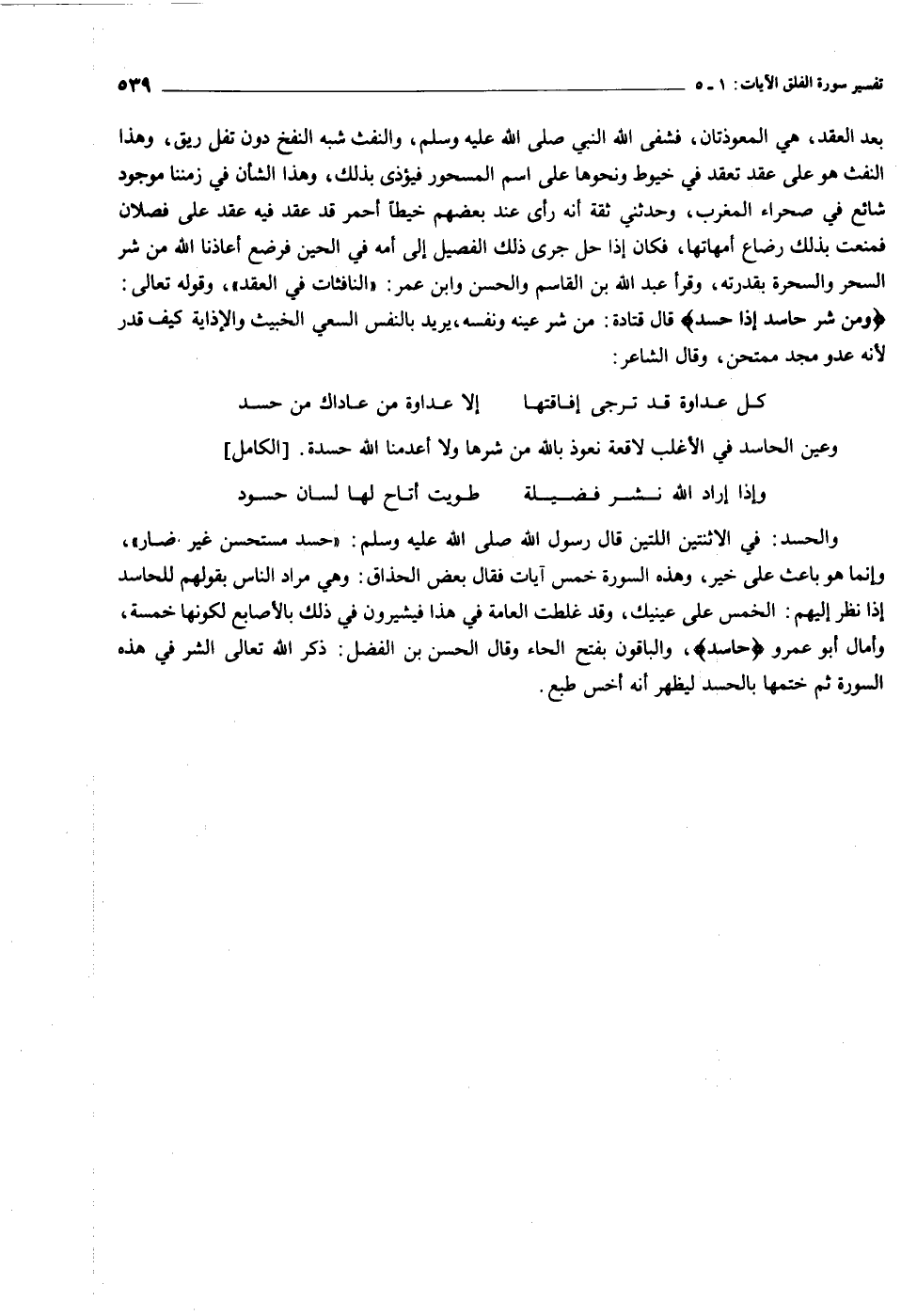 بعد العقد، هي المعوذتان، فشفى الله النبي صلى الله عليه وسلم، والنفث شبه النفخ دون تفل ريق، وهذا النفث هو على عقد تعقد في خيوط ونحوها على اسم المسحور فيؤذى بذلك، وهذا الشأن في زمننا موجود شائع في صحراء المغرب، وحدثني ثقة أنه رأى عند بعضهم خيطا أحمر قد عقد فيه عقد على فصلان فمنعت بذلك رضاع أمهاتها، فكان إذا حل جرى ذلك الفصيل إلى أمه في الحين فرضع أعاذنا الله من شر السحر والسحرة بقدرته، وقرأ عبد الله بن القاسم والحسن وابن عمر: «النافثات في العقد» ، وقوله تعالى: