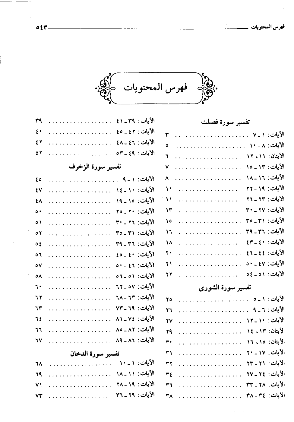 فهرس المحتويات تفسير سورة فصلت الآيات: ١- ٧ ٣ الآيات: ٨- ١٠ ٥ الآيتان: ١١، ١٢ ٦ الآيات: ١٣- ١٥ ٧ الآيات: ١٦- ١٨ ٨ الآيات: ١٩- ٢٢ ١٠ الآيات: ٢٣- ٢٦ ١١ الآيات: ٢٧- ٣٠ ١٣ الآيات: ٣١- ٣٥ ١٥ الآيات: ٣٦- ٣٩ ١٦ الآيات: ٤٠- ٤٣ ١٨ الآيات: ٤٤- ٤٦ ٢٠ الآيات: ٤٧- ٥٠ ٢١ الآيات: ٥١- ٥٤ ٢٢ تفسير سورة الشورى الآيات: ١- ٥ ٢٥ الآيات: ٦- ٩ ٢٦ الآيات: ١٠- ١٢ ٢٧ الآيتان: ١٣، ١٤ ٢٩ الآيتان: ١٥، ١٦ ٣٠ الآيات: ١٧- ٢٠ ٣١ الآيات: ٢١- ٢٣ ٣٢ الآيات: ٢٤- ٢٧ ٣٤ الآيات: ٢٨- ٣٣ ٣٦ الآيات: ٣٤- ٣٨ ٣٨ الآيات: ٣٩- ٤١ ٣٩ الآيات: ٤٢- ٤٥ ٤٠ الآيات: ٤٦- ٤٨ ٤٢ الآيات: ٤٩- ٥٣ ٤٢ تفسير سورة الزخرف الآيات: ١- ٩ ٤٥ الآيات: ١٠- ١٤ ٤٧ الآيات: ١٥- ١٩ ٤٨ الآيات: ٢٠- ٢٥ ٥٠ الآيات: ٢٦- ٣٠ ٥١ الآيات: ٣١- ٣٥ ٥٢ الآيات: ٣٦- ٣٩ ٥٤ الآيات: ٤٠- ٤٥ ٥٦ الآيات: ٤٦- ٥٠ ٥٧ الآيات: ٥١- ٥٦ ٥٨ الآيات: ٥٧- ٦٢ ٦٠ الآيات: ٦٣- ٦٨ ٦٢ الآيات: ٦٩- ٧٣ ٦٣ الآيات: ٧٤- ٨١ ٦٤ الآيات: ٨٢- ٨٥ ٦٦ الآيات: ٨٦- ٨٩ ٦٧ تفسير سورة الدخان الآيات: ١- ١٠ ٦٨ الآيات: ١١- ١٨ ٦٩ الآيات: ١٩- ٢٨ ٧١ الآيات: ٢٩- ٣٦ ٧٣
