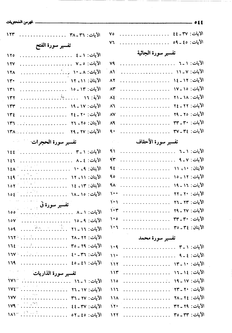 الآيات: ٣٧- ٤٤ ٧٥ الآيات: ٤٥- ٥٩ ٧٦ تفسير سورة الجاثية الآيات: ١- ٦ ٧٩ الآيات: ٧- ١١ ٨١ الآيات: ١٢- ١٤ ٨٢ الآيات: ١٥- ١٧ ٨٣ الآيات: ١٨- ٢١ ٨٤ الآيات: ٢٢- ٢٤ ٨٦ الآيات: ٢٥- ٢٩ ٨٧ الآيات: ٣٠- ٣٣ ٨٩ الآيات: ٣٤- ٣٧ ٩٠ تفسير سورة الأحقاف الآيات: ١- ٦ ٩١ الآيات: ٧- ٩ ٩٣ الآيتان: ١٠، ١١ ٩٤ الآيات: ١٢- ١٥ ٩٥ الآيات: ١٦- ١٩ ٩٨ الآيات: ٢٠- ٢٢ ١٠٠ الآيات: ٢٣- ٢٦ ١٠١ الآيات: ٢٧- ٢٩ ١٠٣ الآيات: ٣٠- ٣٣ ١٠٥ الآيات: ٣٤- ٣٥ ١٠٦ تفسير سورة محمد الآيات: ١- ٣ ١٠٩ الآيات: ٤- ٩ ١١٠ الآيات: ١٠- ١٣ ١١٢ الآيات: ١٤- ١٦ ١١٣ الآيات: ١٧- ١٩ ١١٥ الآيات: ٢٠- ٢٣ ١١٦ الآيات: ٢٤- ٢٨ ١١٨ الآيات: ٢٩- ٣٢ ١٢٠ الآيات: ٣٣- ٣٥ ١٢٢ الآيات: ٣٦- ٣٨ ١٢٣ تفسير سورة الفتح الآيات: ١- ٤ ١٢٥ الآيات: ٥- ٧ ١٢٧ الآيات: ٨- ١٠ ١٢٨ الآيتان: ١١، ١٢ ١٣٠ الآيات: ١٣- ١٥ ١٣١ الآية: ١٦ ١٣٢ الآيات: ١٧- ١٩ ١٣٣ الآيات: ٢٠- ٢٤ ١٣٤ الآيتان: ٢٥، ٢٦ ١٣٦ الآيات: ٢٧- ٢٩ ١٣٨ تفسير سورة الحجرات الآيات: ١- ٣ ١٤٤ الآيات: ٤- ٨ ١٤٦ الآيتان: ٩، ١٠ ١٤٨ الآيتان: ١١، ١٢ ١٤٩ الآيتان: ١٣، ١٤ ١٥٢ الآيات: ١٥- ١٨ ١٥٤ تفسير سورة ق الآيات: ١- ٨ ١٥٥ الآيات: ٩- ١٥ ١٥٧ الآيات: ١٦- ٢١ ١٥٩ الآيات: ٢٢- ٢٨ ١٦٢ الآيات: ٢٩- ٣٥ ١٦٤ الآيات: ٣٦- ٤٠ ١٦٧ الآيات: ٤١- ٤٥ ١٦٩ تفسير سورة الذاريات الآيات: ١- ١٦ ١٧١ الآيات: ١٧- ٢٦ ١٧٤ الآيات: ٢٧- ٣٦ ١٧٧ الآيات: ٣٧- ٤٤ ١٧٩ الآيات: ٤٥- ٥٢ ١٨١