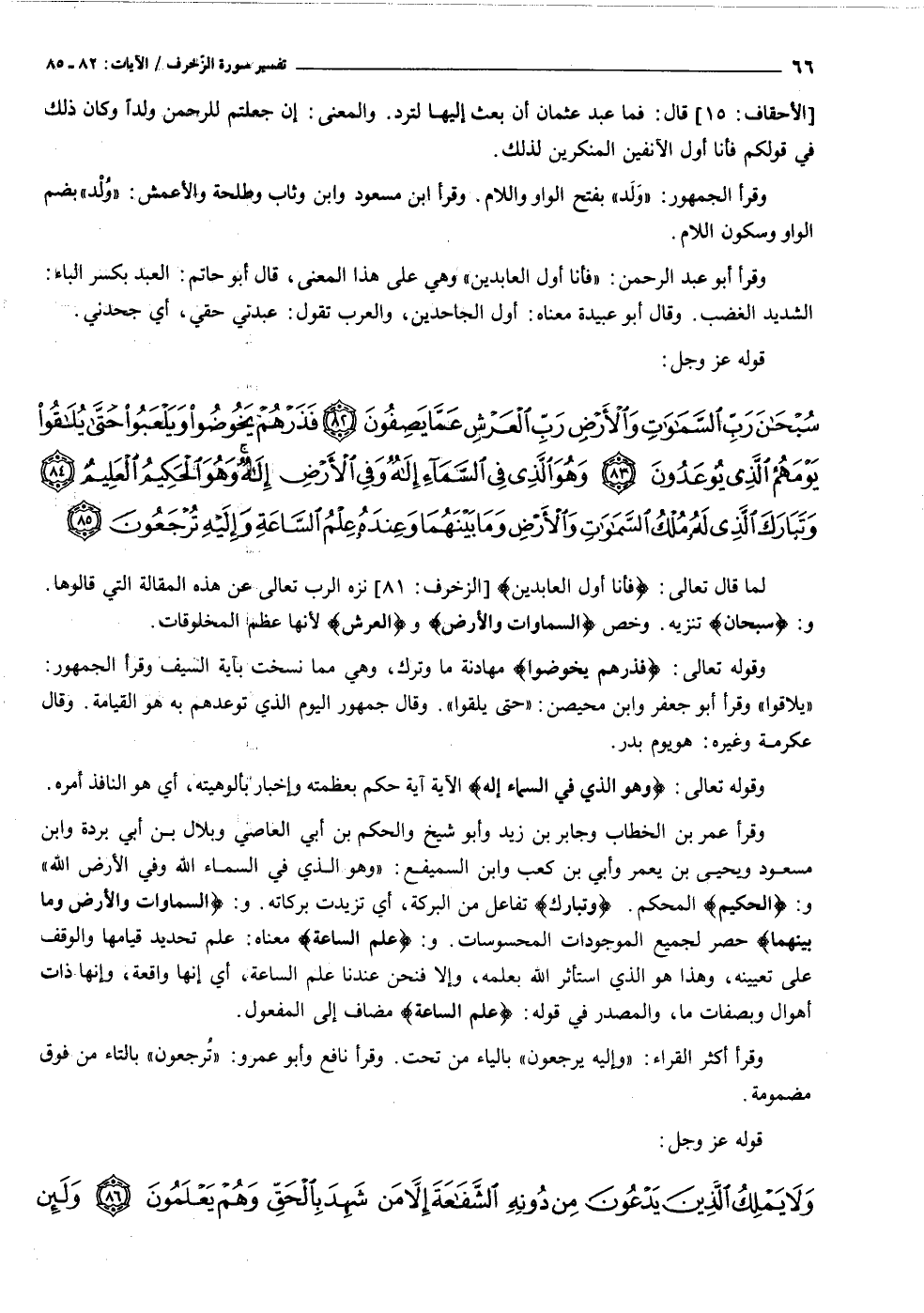 وقرأ عمر بن الخطاب وجابر بن زيد وأبو شيخ والحكم بن أبي العاصي وبلال بن أبي بردة وابن مسعود ويحيى بن يعمر وأبي بن كعب وابن السميفع: «وهو الذي في السماء الله وفي الأرض الله» و: الْحَكِيمُ المحكم. وَتَبارَكَ تفاعل من البركة، أي تزيدت بركاته. و: السَّماواتِ وَالْأَرْضِ وَما بَيْنَهُما حصر لجميع الموجودات المحسوسات. و: عِلْمُ السَّاعَةِ معناه: علم تحديد قيامها والوقف على تعيينه، وهذا هو الذي استأثر الله بعلمه، وإلا فنحن عندنا علم الساعة، أي إنها واقعة، وإنها ذات أهوال وبصفات ما، والمصدر في قوله: عِلْمُ السَّاعَةِ مضاف إلى المفعول.