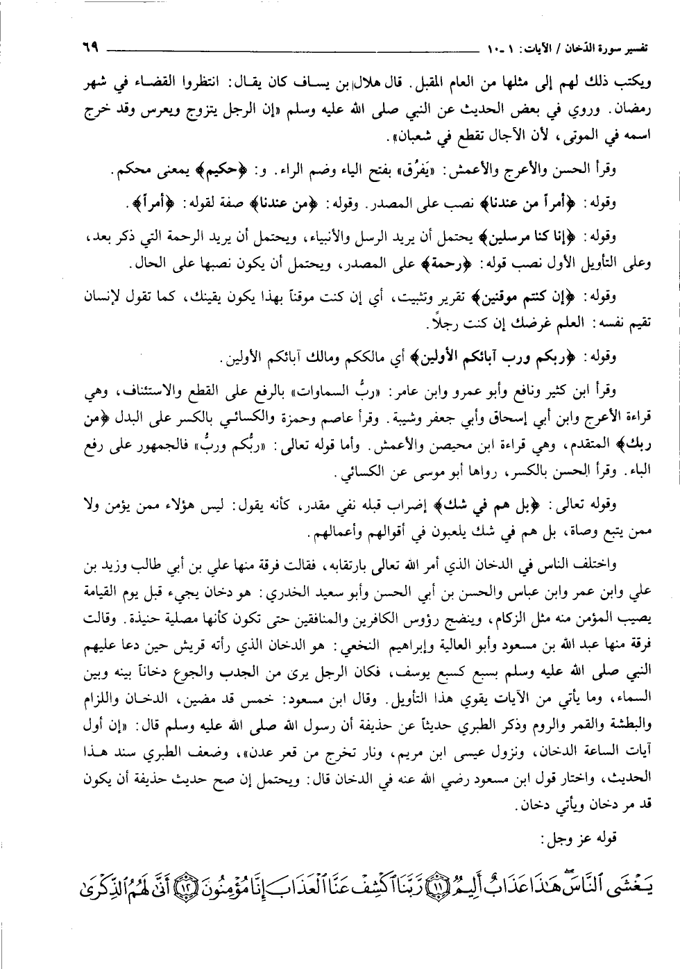واختلف الناس في الدخان الذي أمر الله تعالى بارتقابه، فقالت فرقة منها علي بن أبي طالب وزيد بن علي وابن عمر وابن عباس والحسن بن أبي الحسن وأبو سعيد الخدري: هو دخان يجيء قبل يوم القيامة يصيب المؤمن منه مثل الزكام، وينضج رؤوس الكافرين والمنافقين حتى تكون كأنها مصلية حنيذة. وقالت فرقة منها عبد الله بن مسعود وأبو العالية وإبراهيم النخعي: هو الدخان الذي رأته قريش حين دعا عليهم النبي صلى الله عليه وسلم بسبع كسبع يوسف، فكان الرجل يرى من الجدب والجوع دخانا بينه وبين السماء، وما يأتي من الآيات يقوي هذا التأويل. وقال ابن مسعود: خمس قد مضين، الدخان واللزام والبطشة والقمر والروم وذكر الطبري حديثا عن حذيفة أن رسول الله صلى الله عليه وسلم قال: «إن أول آيات الساعة الدخان، ونزول عيسى ابن مريم، ونار تخرج من قعر عدن» ، وضعف الطبري سند هذا الحديث، واختار قول ابن مسعود رضي الله عنه في الدخان قال: ويحتمل إن صح حديث حذيفة أن يكون قد مر دخان ويأتي دخان.