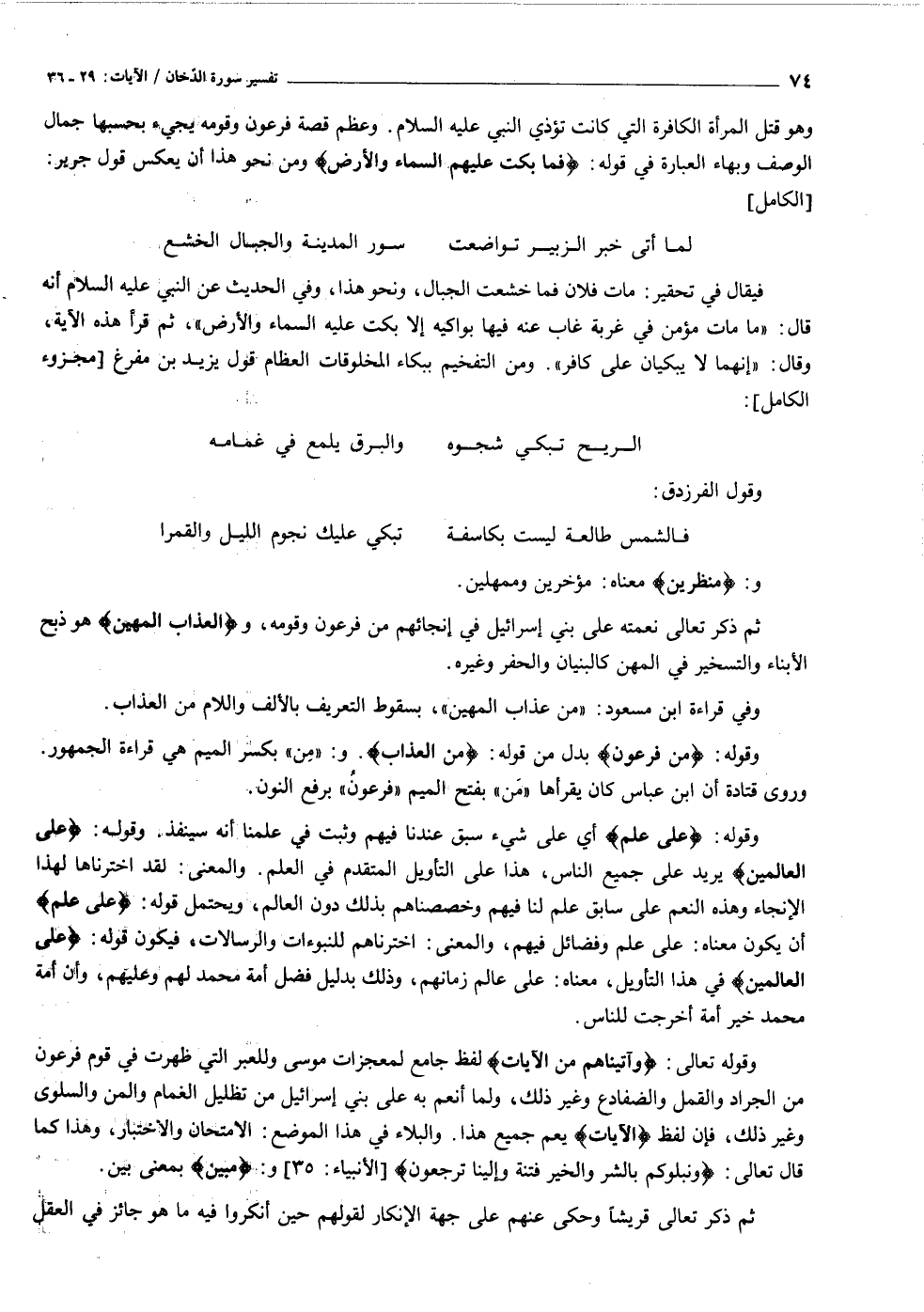 فيقال في تحقير: مات فلان فما خشعت الجبال، ونحو هذا، وفي الحديث عن النبي عليه السلام أنه قال: «ما مات مؤمن في غربة غاب عنه فيها بواكيه إلا بكت عليه السماء والأرض» ، ثم قرأ هذه الآية، وقال: «إنهما لا يبكيان على كافر» . ومن التفخيم ببكاء المخلوقات العظام قول يزيد بن مفرغ [مجزوء الكامل] :