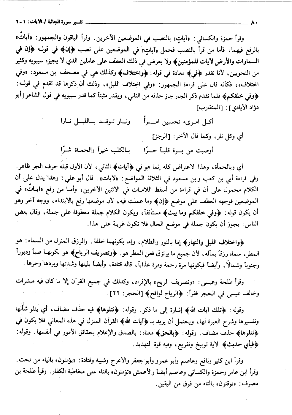 وقرأ حمزة والكسائي: «آيات» بالنصب في الموضعين الآخرين. وقرأ الباقون والجمهور: «آيات» بالرفع فيهما، فأما من قرأ بالنصب فحمل «آيات» في الموضعين على نصب إِنَّ في قوله إِنَّ فِي السَّماواتِ وَالْأَرْضِ لَآياتٍ لِلْمُؤْمِنِينَ ولا يعرض في ذلك العطف على عاملين الذي لا يجيزه سيبويه وكثير من النحويين، لأنا نقدر فِي معادة في قوله: وَاخْتِلافِ وكذلك هي في مصحف ابن مسعود: «وفي اختلاف» ، فكأنه قال على قراءة الجمهور: «وفي اختلاف الليل» ، وذلك أن ذكرها قد تقدم في قوله: