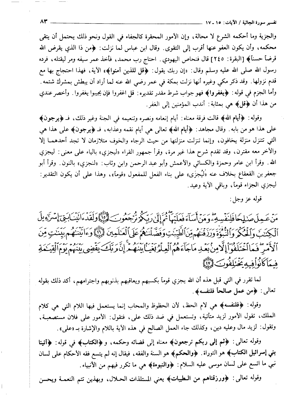 مَنْ عَمِلَ صالِحاً فَلِنَفْسِهِ وَمَنْ أَساءَ فَعَلَيْها ثُمَّ إِلى رَبِّكُمْ تُرْجَعُونَ (١٥) وَلَقَدْ آتَيْنا بَنِي إِسْرائِيلَ الْكِتابَ وَالْحُكْمَ وَالنُّبُوَّةَ وَرَزَقْناهُمْ مِنَ الطَّيِّباتِ وَفَضَّلْناهُمْ عَلَى الْعالَمِينَ (١٦) وَآتَيْناهُمْ بَيِّناتٍ مِنَ الْأَمْرِ فَمَا اخْتَلَفُوا إِلاَّ مِنْ بَعْدِ ما جاءَهُمُ الْعِلْمُ بَغْياً بَيْنَهُمْ إِنَّ رَبَّكَ يَقْضِي بَيْنَهُمْ يَوْمَ الْقِيامَةِ فِيما كانُوا فِيهِ يَخْتَلِفُونَ (١٧)