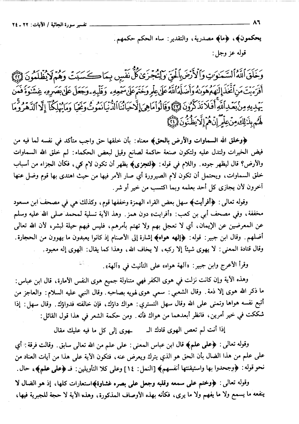 وَخَلَقَ اللَّهُ السَّماواتِ وَالْأَرْضَ بِالْحَقِّ وَلِتُجْزى كُلُّ نَفْسٍ بِما كَسَبَتْ وَهُمْ لا يُظْلَمُونَ (٢٢) أَفَرَأَيْتَ مَنِ اتَّخَذَ إِلهَهُ هَواهُ وَأَضَلَّهُ اللَّهُ عَلى عِلْمٍ وَخَتَمَ عَلى سَمْعِهِ وَقَلْبِهِ وَجَعَلَ عَلى بَصَرِهِ غِشاوَةً فَمَنْ يَهْدِيهِ مِنْ بَعْدِ اللَّهِ أَفَلا تَذَكَّرُونَ (٢٣) وَقالُوا ما هِيَ إِلاَّ حَياتُنَا الدُّنْيا نَمُوتُ وَنَحْيا وَما يُهْلِكُنا إِلاَّ الدَّهْرُ وَما لَهُمْ بِذلِكَ مِنْ عِلْمٍ إِنْ هُمْ إِلاَّ يَظُنُّونَ (٢٤)