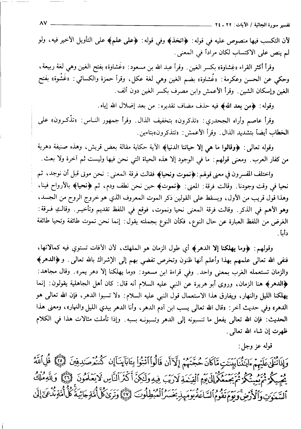 وقولهم: وَما يُهْلِكُنا إِلَّا الدَّهْرُ أي طول الزمان هو المهلك، لأن الآفات تستوي فيه كمالاتها، فنفى الله تعالى علمهم بهذا وأعلم أنها ظنون وتخرص تفضي بهم إلى الإشراك بالله تعالى. والدَّهْرُ والزمان تستعمله الغرب بمعنى واحد. وفي قراءة ابن مسعود: «وما يهلكنا إلا دهر يمر» . وقال مجاهد: