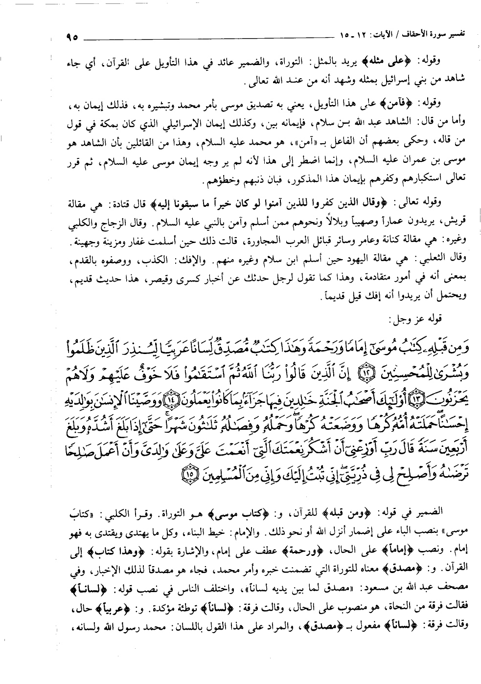 وَمِنْ قَبْلِهِ كِتابُ مُوسى إِماماً وَرَحْمَةً وَهذا كِتابٌ مُصَدِّقٌ لِساناً عَرَبِيًّا لِيُنْذِرَ الَّذِينَ ظَلَمُوا وَبُشْرى لِلْمُحْسِنِينَ (١٢) إِنَّ الَّذِينَ قالُوا رَبُّنَا اللَّهُ ثُمَّ اسْتَقامُوا فَلا خَوْفٌ عَلَيْهِمْ وَلا هُمْ يَحْزَنُونَ (١٣) أُولئِكَ أَصْحابُ الْجَنَّةِ خالِدِينَ فِيها جَزاءً بِما كانُوا يَعْمَلُونَ (١٤) وَوَصَّيْنَا الْإِنْسانَ بِوالِدَيْهِ إِحْساناً حَمَلَتْهُ أُمُّهُ كُرْهاً وَوَضَعَتْهُ كُرْهاً وَحَمْلُهُ وَفِصالُهُ ثَلاثُونَ شَهْراً حَتَّى إِذا بَلَغَ أَشُدَّهُ وَبَلَغَ أَرْبَعِينَ سَنَةً قالَ رَبِّ أَوْزِعْنِي أَنْ أَشْكُرَ نِعْمَتَكَ الَّتِي أَنْعَمْتَ عَلَيَّ وَعَلى والِدَيَّ وَأَنْ أَعْمَلَ صالِحاً تَرْضاهُ وَأَصْلِحْ لِي فِي ذُرِّيَّتِي إِنِّي تُبْتُ إِلَيْكَ وَإِنِّي مِنَ الْمُسْلِمِينَ (١٥)