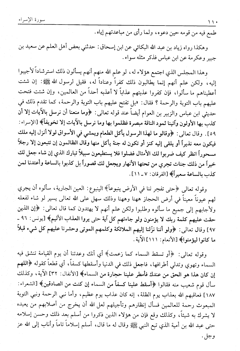 وَهَذَا الْمَجْلِسُ الَّذِي اجْتَمَعَ هَؤُلَاءِ لَهُ، لَوْ عَلِمَ اللَّهُ مِنْهُمْ أَنَّهُمْ يَسْأَلُونَ ذَلِكَ اسْتِرْشَادًا لَأُجِيبُوا إِلَيْهِ، وَلَكِنْ عَلِمَ أَنَّهُمْ إِنَّمَا يطالبون ذلك كفرا وعنادا له، فقيل لِرَسُولِ اللَّهِ صَلَّى اللَّهُ عَلَيْهِ وَسَلَّمَ: أَنَّ شِئْتَ أَعْطَيْنَاهُمْ مَا سَأَلُوا، فَإِنْ كَفَرُوا عَذَّبْتُهُمْ عَذَابًا لَا أُعَذِّبُهُ أَحَدًا مِنَ الْعَالَمِينَ، وَإِنْ شِئْتَ فَتَحْتُ عَلَيْهِمْ بَابَ التَّوْبَةِ وَالرَّحْمَةِ؟ فَقَالَ: «بَلْ تَفْتَحُ عَلَيْهِمْ بَابَ التَّوْبَةِ وَالرَّحْمَةِ، كَمَا تَقَدَّمَ ذَلِكَ فِي حَدِيثَيِ ابْنِ عَبَّاسٍ وَالزُّبَيْرِ بْنِ الْعَوَّامِ أَيْضًا عِنْدَ قَوْلِهِ تَعَالَى: وَما مَنَعَنا أَنْ نُرْسِلَ بِالْآياتِ إِلَّا أَنْ كَذَّبَ بِهَا الْأَوَّلُونَ وَآتَيْنا ثَمُودَ النَّاقَةَ مُبْصِرَةً فَظَلَمُوا بِها وَما نُرْسِلُ بِالْآياتِ إِلَّا تَخْوِيفاً [الْإِسْرَاءِ: