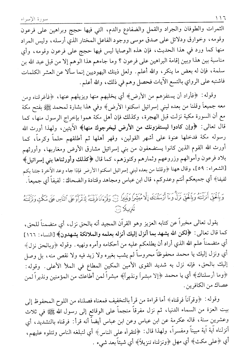 وَبِالْحَقِّ أَنْزَلْناهُ وَبِالْحَقِّ نَزَلَ وَما أَرْسَلْناكَ إِلاَّ مُبَشِّراً وَنَذِيراً (105) وَقُرْآناً فَرَقْناهُ لِتَقْرَأَهُ عَلَى النَّاسِ عَلى مُكْثٍ وَنَزَّلْناهُ تَنْزِيلاً (106)